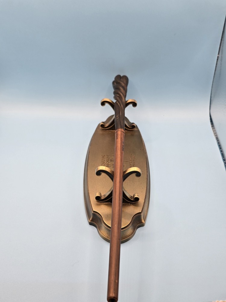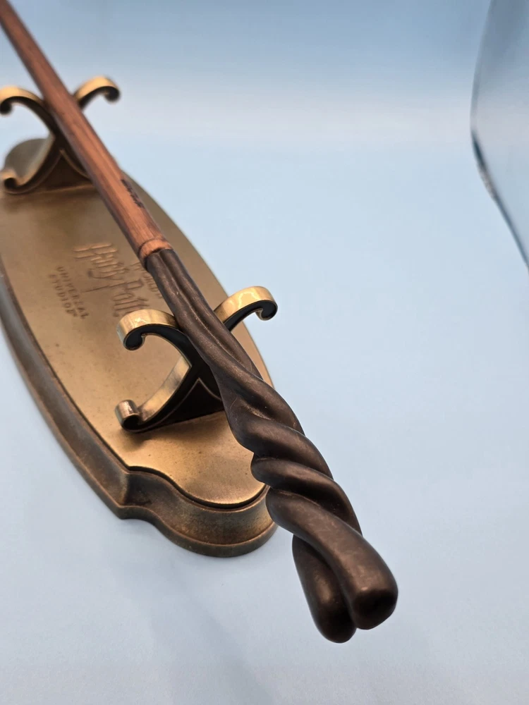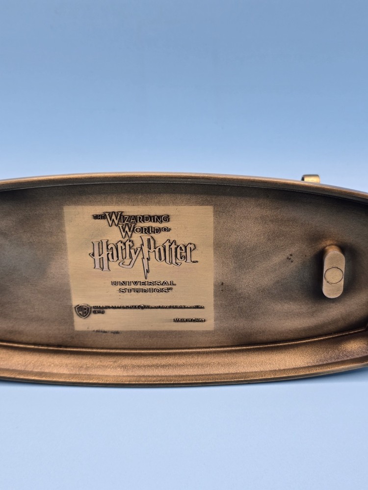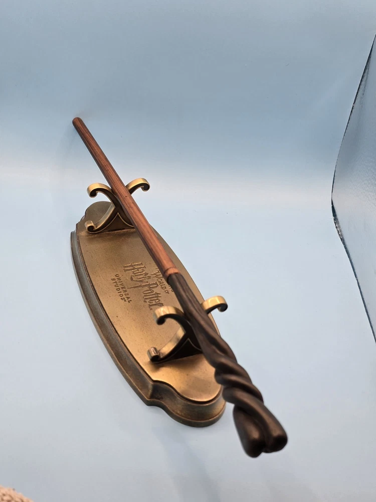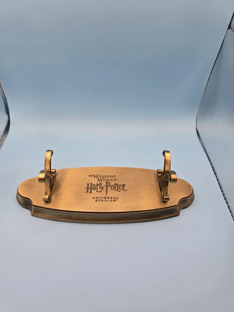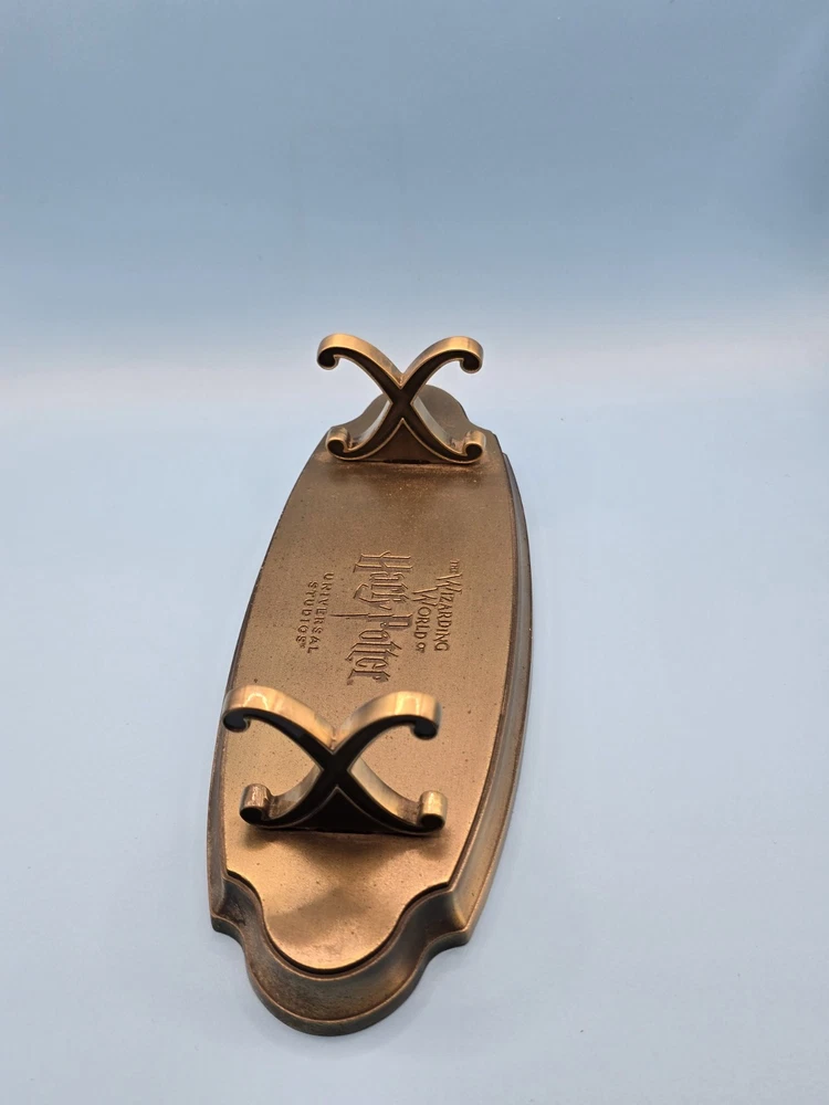 Official Harry Potter Wand & Wall Display Set – Universal Studios Authentic Wizarding World of Harry Potter merchandise from Universal Studios. This listing includes one official character wand and one official metal wall-mounted wand display, sold together as a set. The wall display is a cast metal plaque with an antique brass finish and embossed The Wizarding World of Harry Potter and Universal Studios branding. Designed to hold a single wand horizontally. Original Universal Studios authentication sticker is present on the back. The wand is an authentic Universal Studios park wand with wood-look finish and printed SKU text. Tip is intact with no cracks or breaks. Condition: Both items are in very good used condition. The display shows light surface patina and minor speckling consistent with normal factory finish and age. No bends, cracks, or broken brackets. The wand shows light handling wear from display use only. Details: Brand: Universal Studios Franchise: Harry Potter Theme Park: The Wizarding World of Harry Potter Material (display): Metal Finish: Antique brass Mounting: Wall-mounted (hardware not included) Country of Manufacture: China Notes: Sold as a set (wand + display) This is official park merchandise, not a replica Please review all photos for exact condition and details Carefully packed and shipped promptly.