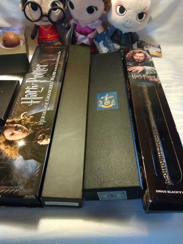 I listed these as used only because they have been stored for a while and the boxes are not in mint condition. And there is not a box for the quidditch balls. 4 wands 3 Funko plush, bookmarks playing cards, poster. All contents in good condition. Would make a great Christmas present for the Harry Potter lover.