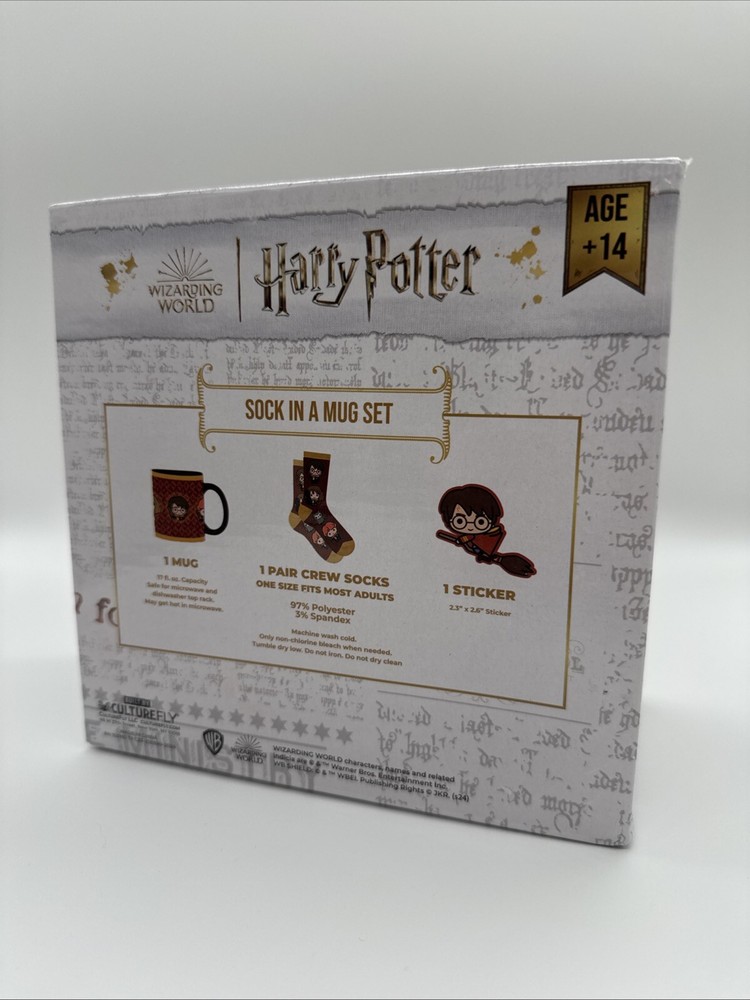 The Wizarding World Harry Potter Sock in a mug Gift Set includes a new mug, socks, and a sticker featuring elements from the Harry Potter franchise. This set is designed for fans of fantasy and the magical world of Harry Potter, offering a collectible item that combines both practicality and fandom. The inclusion of a unique mug, comfortable socks, and a sticker adds to the appeal of this gift set for Potterheads looking to add to their collection of Harry Potter merchandise.