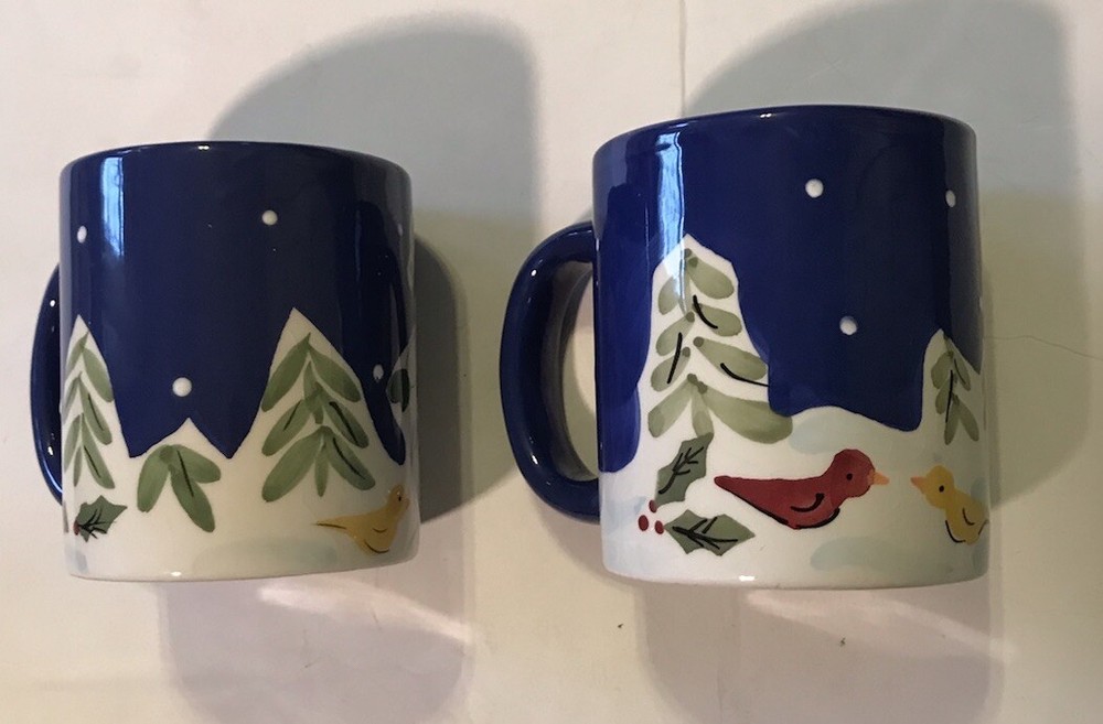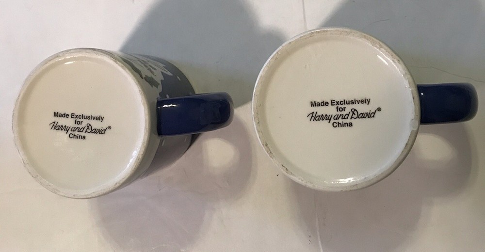 This two-piece set of Christmas mugs from Harry and David is perfect for enjoying hot or cold beverages during the holiday season. The 14 oz. ceramic and porcelain mugs feature a contemporary design with an all-over snowman and reindeer pattern. They are hand wash only and come with drink-through lids. These original mugs are decorated with painted and vintage elements and are perfect for collectors or those who just want to add a touch of holiday cheer to their kitchen. Each mug is 4 inches tall, 5 inches wide, and has a diameter of 3.5 inches. Get in the Christmas spirit with these beautiful and functional mugs from Harry and David. Some crazing.