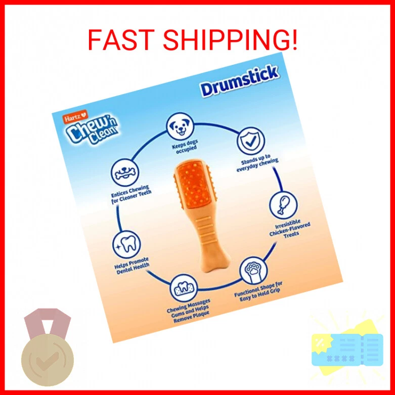 100% Genuine Free Shipping Gift Cards Welcome Hartz Chew ‘n Clean Chew Toy and Treat in One Chicken Flavored Drumstick Dog Toy, Extra Small - Combines a durable nylon outer shell embedded with delicious chicken-flavored treats for overall chewing satisfaction. Suitable for teething puppies and adult dogs. - The toy’s outer shell has nubs and contours that gently massage your dog’s gums and help to clean teeth by keeping tartar and plaque at bay, along with freshening breath. - Each toy has embedded chicken-flavored treats to entice chewing and is ideal for moderate, non-aggressive chewers. - The unique and functional drumstick shape is designed to be easy for dogs to hold with their paws and grasp in their mouth. - This fun drumstick chew toy is available in an extra small size (dogs under 10 pounds) and in a small size (dogs 10 to 20 pounds). Payments We accept the following payment methods PayPal Please pay as soon as possible after winning an auction, this will allow for quicker shipping times! Returns We accept returns. You can return unopened items in the original packaging within 30 days of your purchase with receipt or proof of purchase. If 30 days or more have passed since your purchase, we cannot offer you a refund or an exchange. Upon receipt of the returned item, we will fully examine it and notify you via email, within a reasonable period of time, whether you are entitled to a return. If you are entitled to a return, we will refund your purchase price and a credit will automatically be applied to your original method of payment. Only regular priced items may be refunded. Sale items are non-refundable. Shipping Shipment processing time All orders are processed within 2-3 business days. Orders are not shipped or delivered on weekends or holidays. If we are experiencing a high volume of orders, shipments may be delayed by a few days. Please allow additional days in transit for delivery. If there will be a significant delay in shipment of your order, we will contact you via email or telephone. Shipping rates & delivery estimates Shipping charges for your order will be calculated and displayed at checkout.