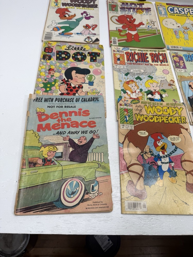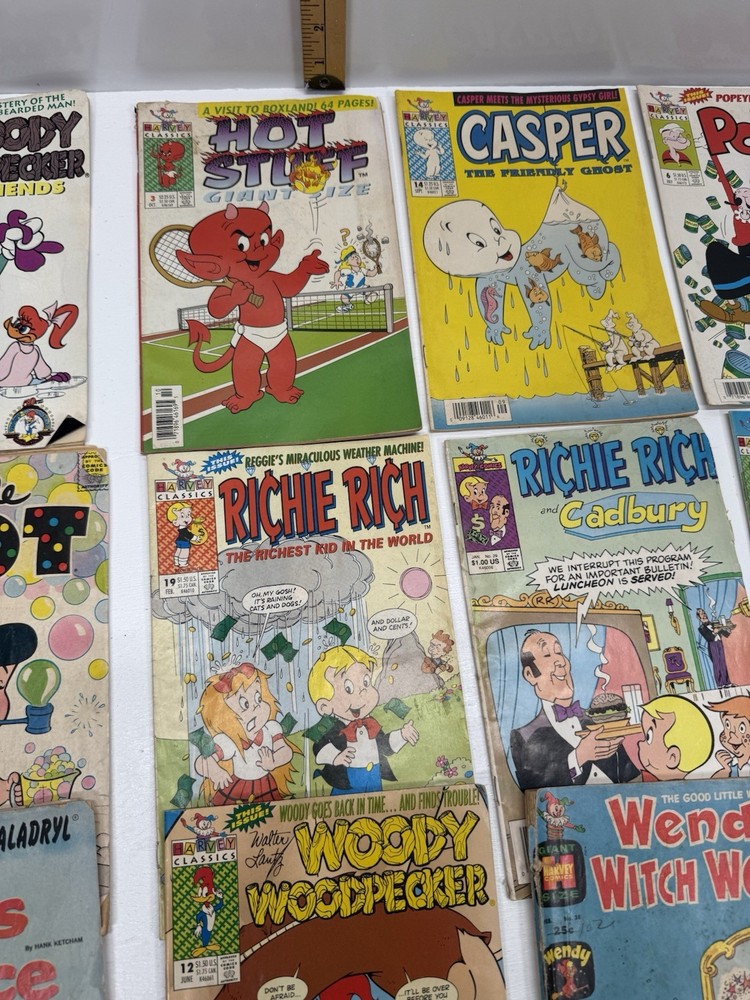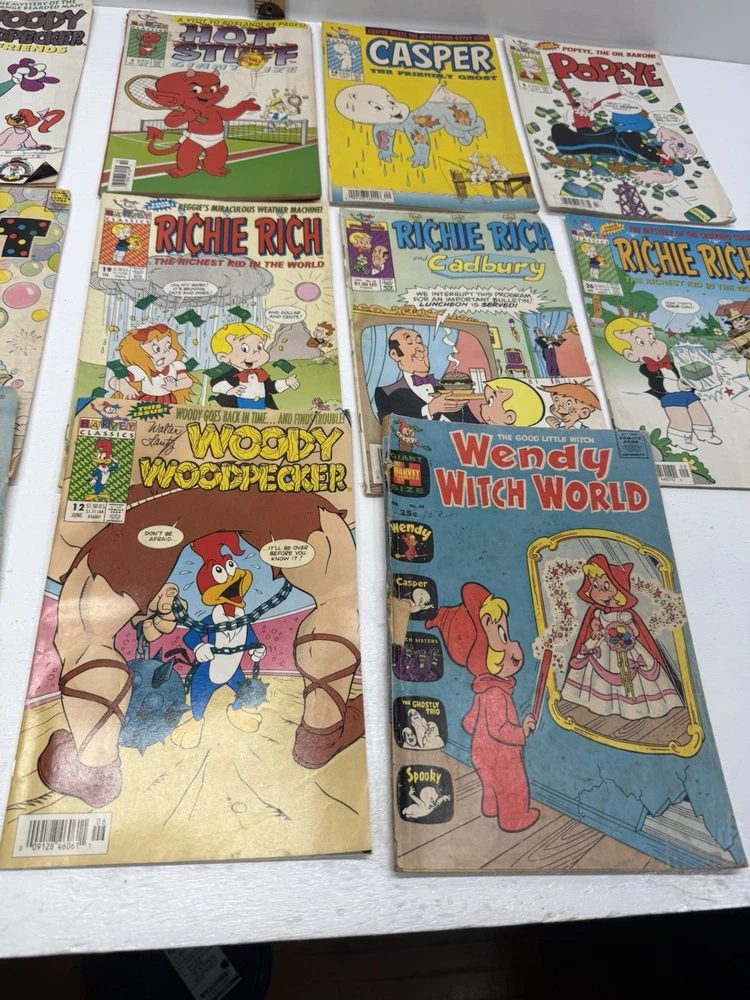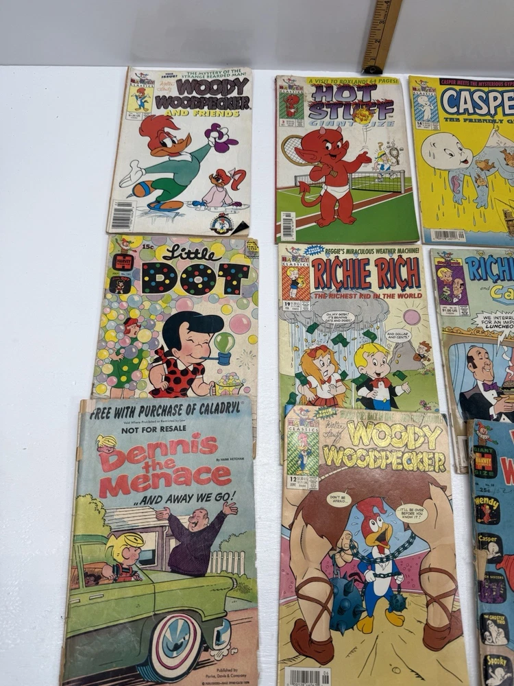 Large vintage Harvey Comics lot including classic characters: • Richie Rich (multiple issues) • Casper the Friendly Ghost • Hot Stuff • Wendy the Good Little Witch • Woody Woodpecker • Little Dot • Popeye • Dennis the Menace (bonus non-Harvey promo issue) Books show various levels of wear including creasing, edge wear, staining, tape, and spine wear. These are reader-grade vintage comics, sold as-is, raw, and ungraded. Great reseller bundle, starter lot, or nostalgia collection. Ships securely with protection. ⚠️ Please note: Any returns will be subject to a 40% restocking fee.