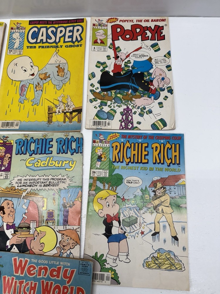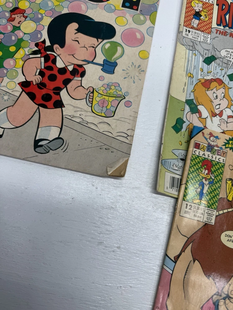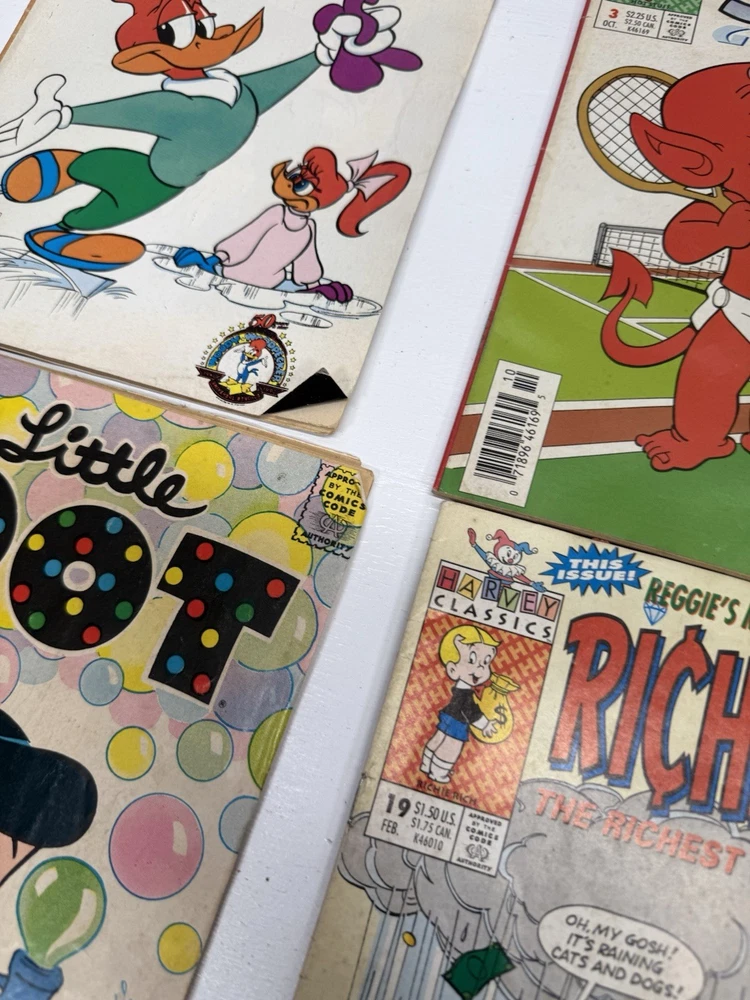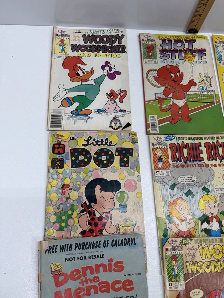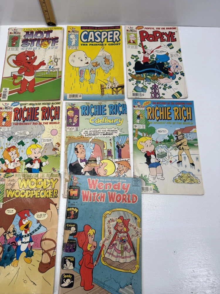 Large vintage Harvey Comics lot including classic characters: • Richie Rich (multiple issues) • Casper the Friendly Ghost • Hot Stuff • Wendy the Good Little Witch • Woody Woodpecker • Little Dot • Popeye • Dennis the Menace (bonus non-Harvey promo issue) Books show various levels of wear including creasing, edge wear, staining, tape, and spine wear. These are reader-grade vintage comics, sold as-is, raw, and ungraded. Great reseller bundle, starter lot, or nostalgia collection. Ships securely with protection. ⚠️ Please note: Any returns will be subject to a 40% restocking fee.