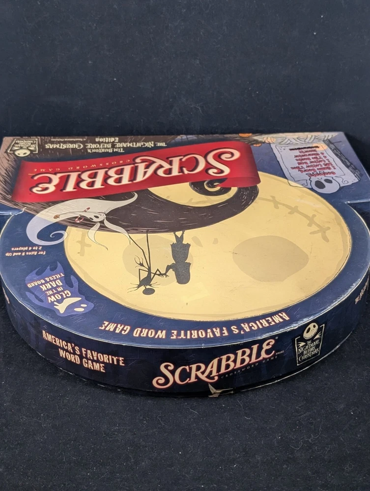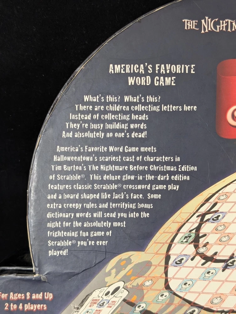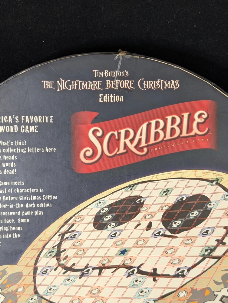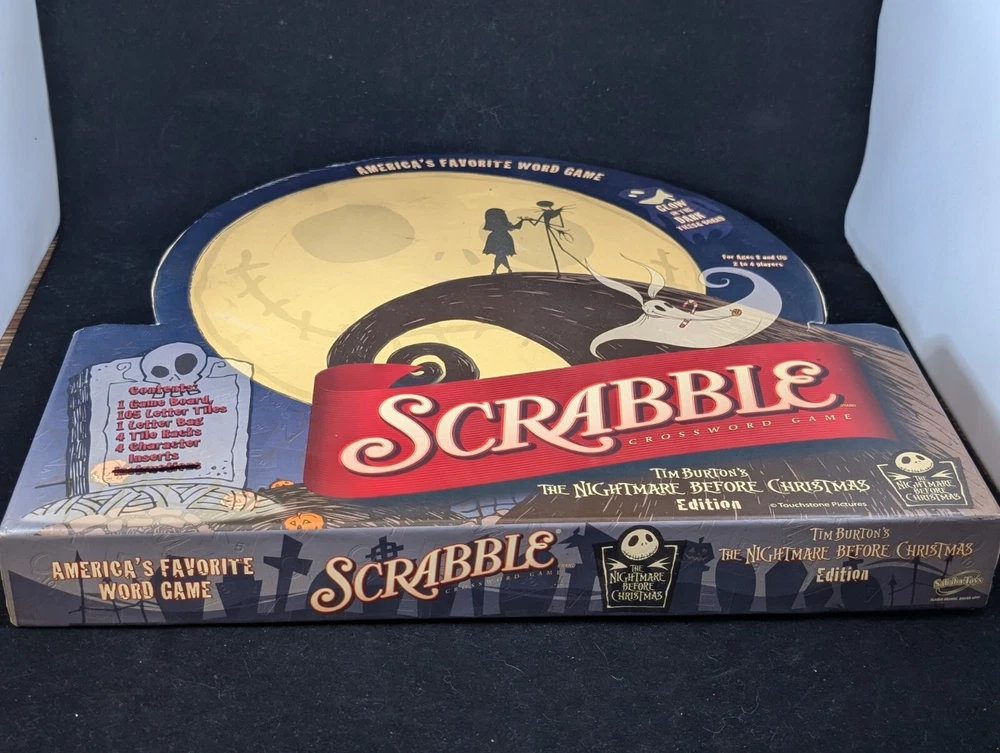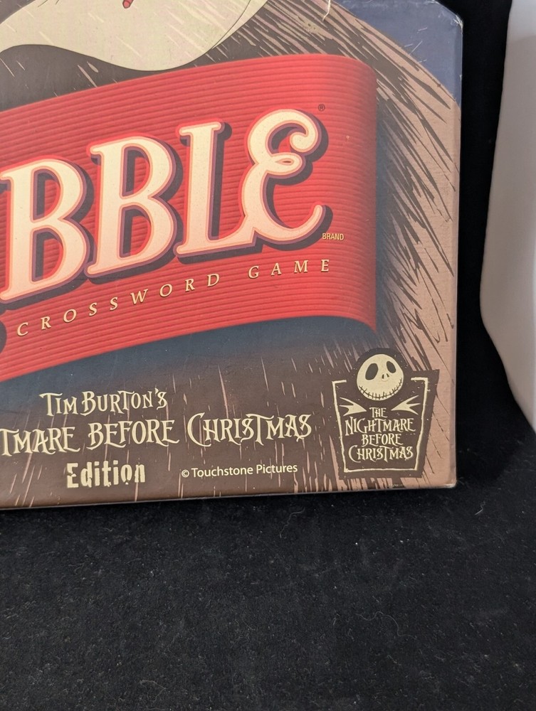 This Hasbro Scrabble game is a must-have for any fan of Tim Burton's The Nightmare Before Christmas. It is a complete board game that can be played by up to 4 players. The game includes all the necessary components, such as the board and tiles. The original instruction sheet is missing however a reprinted section with the rules concerning the deviation from regular scrabble is included. The game is perfect for boys and girls and was manufactured in the United States in 2007. It is a strategy game that can provide hours of fun for the whole family. The game is based on the popular Scrabble brand and features characters from the Nightmare Before Christmas movie.