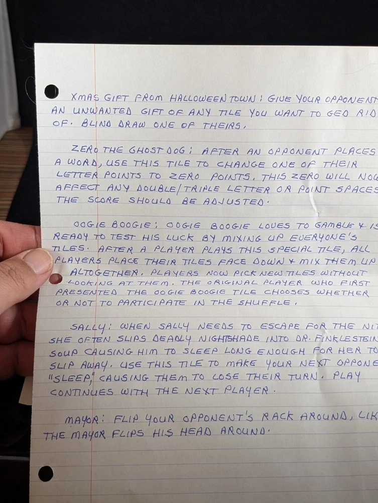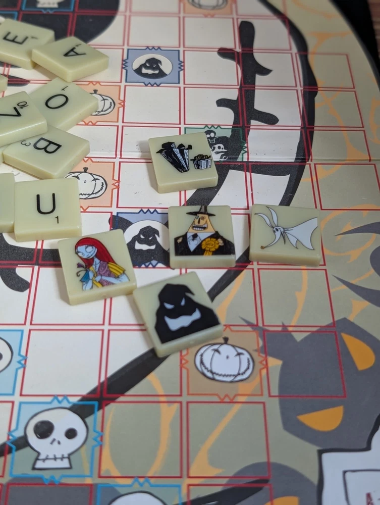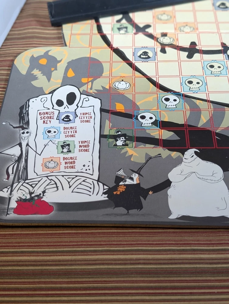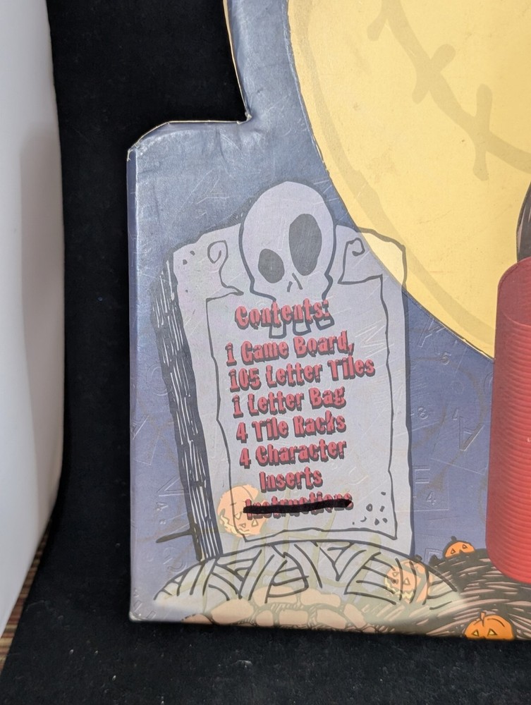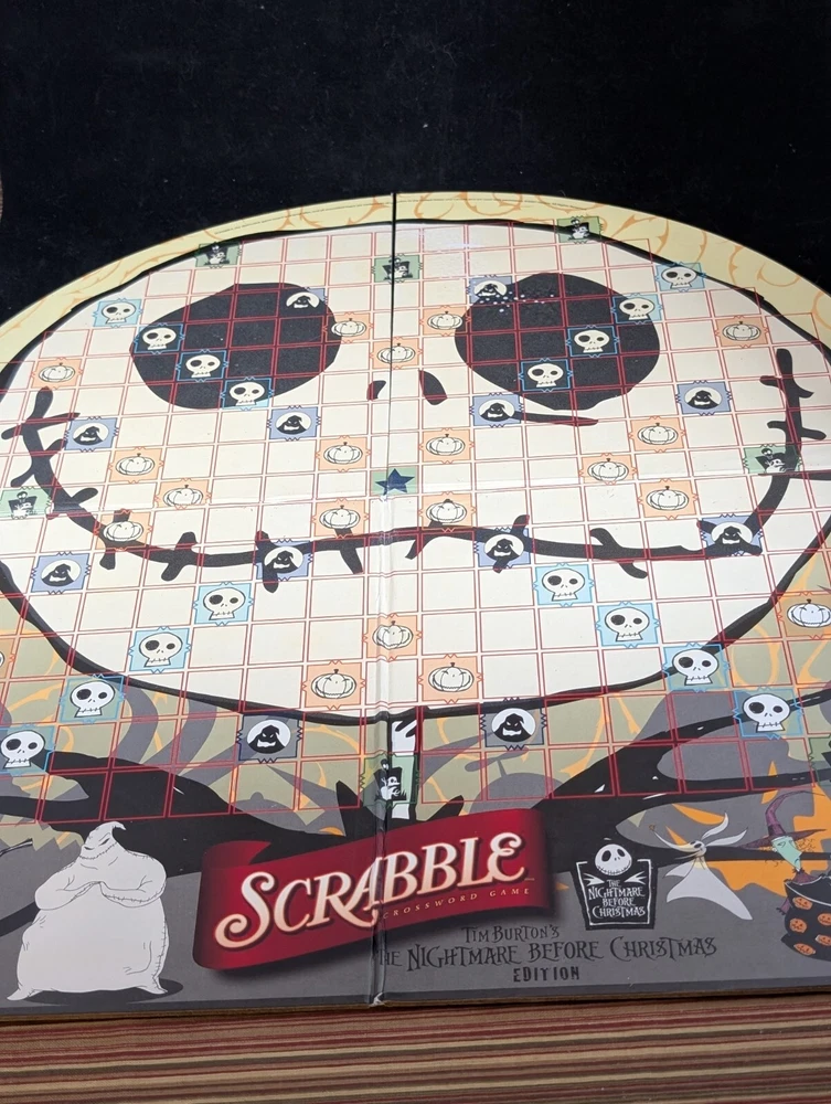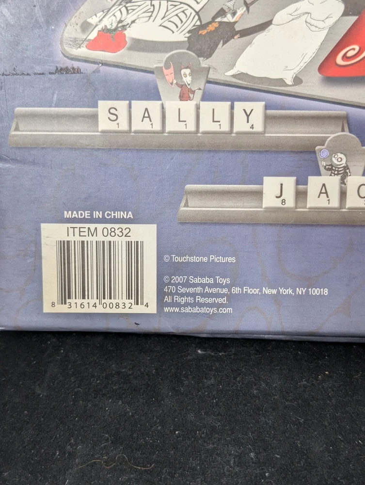 This Hasbro Scrabble game is a must-have for any fan of Tim Burton's The Nightmare Before Christmas. It is a complete board game that can be played by up to 4 players. The game includes all the necessary components, such as the board and tiles. The original instruction sheet is missing however a reprinted section with the rules concerning the deviation from regular scrabble is included. The game is perfect for boys and girls and was manufactured in the United States in 2007. It is a strategy game that can provide hours of fun for the whole family. The game is based on the popular Scrabble brand and features characters from the Nightmare Before Christmas movie.