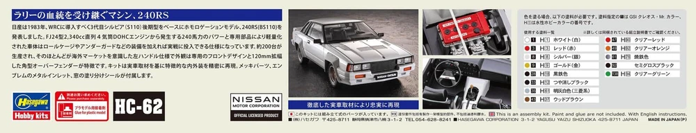 Hasegawa 1/24 Nissan 240RS BS110 1983 Plastic Model Kit HC62 Car Description Thank you for visiting the page! Ships with careful packing from Japan. Description Hasegawa 1/24 Nissan 240RS BS110 1983 Plastic Model HC62 Featuring distinctive angular overfenders, this is a reproduction of the homologation model! The Nissan 240RS (BS110) debuted in 1983 as a rally-spec homologation model (Group B). It was developed based on the later version of the third-generation Silvia S110 and approximately 200 units were produced. The kit is based on actual vehicle research, with many new parts developed for both the exterior and interior. The body parts are from the later model, which has a modified shape near the side turn signals. Some engine components are also included, peeking through the hood louver. The rear window is of the type without defrost lines. Metal inlets and window masking stickers are included. The body parts color is white. Newly molded plastic parts Hood Front/Rear Bumper Body Rear Panel Rear Quarter Panel Mesh Wheels Overfenders Side Turn Signals Tail Light Reflectors Brake Lights Rear Window Engine Head Strut Tower Bar Steering Wheel Dashboard (Left Hand Drive) Front Seats Rear Seats *This product requires assembly and painting as it is a plastic model. *Assembly and painting require additional glue, tools, paint, etc. *“Plastic Model” is a registered trademark of the Japan Plastic Model Industry Cooperative. *This product does not include glue, paint, tools, or batteries. Assembly and painting are required for this plastic model. Additional glue, tools, paint, etc. are necessary. 1/24 scale unpainted plastic assembly kit Completed size: 182×77mm Number of parts: 125 New mold additions. Shipping FedEx, Japan Post, USPS (Not available for selection) Terms of Sale *As a rule, tracking numbers are uploaded within 10 business days of purchase. *In principle, the package will be delivered within 3 weeks after the tracking number is uploaded, but delays may occur depending on international conditions. Please contact your local post office for details. International Buyers - Please Note: Import duties, taxes, and charges are not included in the item price or shipping cost. These charges are the buyer's responsibility. Please check with your country's customs office to determine what these additional costs will be prior to bidding or buying.