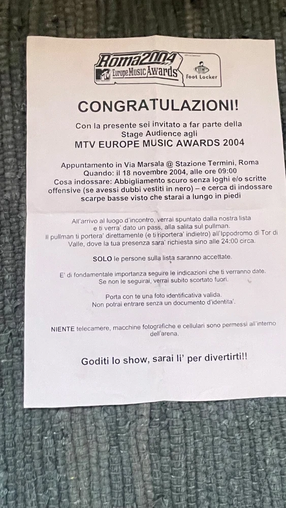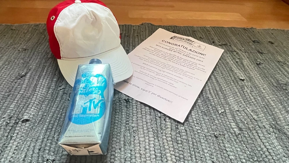 Limited Collection: MTV Europe Music Awards 2004. Collector's Item: MTV Europe Music Awards 2004. These authentic pieces, directly from the 2004 Rome event, are highly sought-after. The hat "beechfield" worn for the choreography on Eminem's piece " Just Lose It " , promotional water bottle (which was distributed at the event), and official event invitation a tangible connection to a legendary night in music. Perfect for any music fan or collector, A must-have for any memorabilia collection. The hat was not worn only that night, the water brick is used. ______________________ Collezione limitata: MTV Europe Music Awards 2004. Questi oggetti, provenienti direttamente dallo storico evento del 2004 a Roma, sono estremamente rari. Il cappello "beechfield" indossato per la coreografia sul pezzo musicale " Just Lose It " di E minem , il brick dell'acqua e la lettera di invito all'evento sono una testimonianza tangibile di una serata indimenticabile. Un'opportunità unica per possedere un pezzo di storia musicale. il cappello non è stato indossato solo quella sera, il brick di acqua è usato.