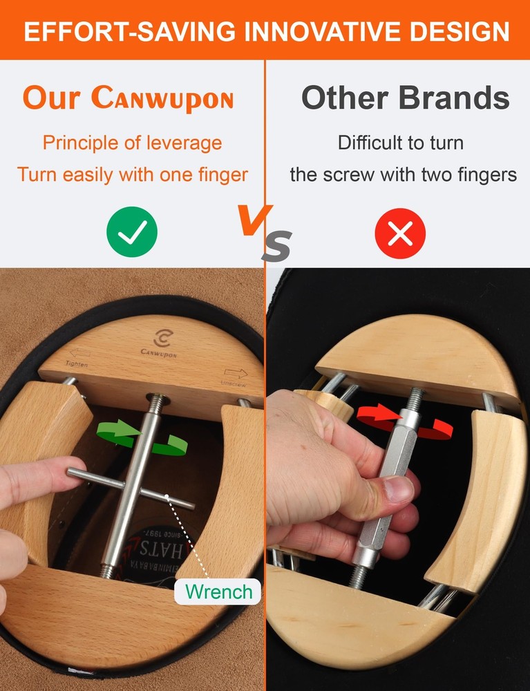 Hat Stretcher for Fitted Cowboy Hats Stretchers for Men - 4 Way Expander Extender Shaper Widener XL Large Size Enlarger (4 Way Wood) Unique Labor-Saving Design: Unlike traditional hat stretcher, Canwupon's hats stretchers adopts an innovative heavy-duty cross-shaped wrench unique design, allowing you to easily rotate the stainless steel rod in the center with just one finger, allowing you to easily expand the size of the hat without any tool . Enjoy an unprecedented convenient experience. Innovative 4 Way Stretching : Our hat stretcher adopts an innovative 4-way extension design, which can evenly stretch the four sides of the hat to prevent the caps from deforming into an oval shape. This innovative design ensures that the force is evenly distributed to the four sides, providing the best stretching and shaping effect for the hat, which can make your ill-fitting hat reach a perfect fit after adjustment, avoiding the replacement of a new hat, saving you money. Super Strong and Durable: Our cowboy hat stretcher enlarger is equipped with stainless steel studs and wrenches and metal nuts , and the structure is very strong, capable of withstanding up to 500 pounds of expansion tension. Stainless steel accessories guarantee long-term non-oxidation and non-rusting, ensuring the long lasting durability of the product. Selected Materials and Exquisite Craftsmanship: Selected Nordic 100% natural beech wood, high density, hard texture, high-grade texture, ensure the durability and high-grade beauty of the product. Each extender is finely hand-polished and oil-sprayed five times by craftsmen, with a smooth surface without burrs and perfect details, ensuring that your hat will not be damaged during the resizing process. Wide Versatility: Our large hat stretcher can be adjusted in a wide range of sizes and are suitable for almost all types of hats, such as cow boy hat, ballcap, Straw Hat, bucket, fedora cowgirl hat, men's leather cowboys hat, black helmet, Baseball , Jack Caps ,stetson hat, sun open road hat, tophat, Felt Ball Cap, military hat, western hats, stretch fit snapback hat, deerstalker hat, and can be reshaper to a fitted size. Hat Stretcher for Fitted Cowboy Hats Stretchers for Men - 4 Way Expander Extender for Baseball and Jack Caps Shaper, Felt Ball Cap Widener, Hat XL Large Size Enlarger with Handle Easy to Stretch Shipping We offer FREE shipping on all orders! We ship within Three business days of payment, usually sooner. We use a selection of shipping services such as UPS, FedEx, USPS etc. We only ship to the lower 48 states, no APO/FPO addresses or PO Boxes allowed. Local pickups and combined shipping options are not provided at this time. Return You can return a product for up to 30 days from the date you purchased it. Any product you return must be in the same condition you received it and in the original packaging. Please keep the receipt. Payment We accept payment by any of the following methods: PayPal Please pay as soon as possible after winning an auction, as that will allow us to post your item to you sooner! Feedback Customer satisfaction is very important to us. If you have any problem with your order, please contact us and we will do our best to make you satisfied. Contact Us If you have any queries, please contact us via ebay. We usually respond within 24 hours on weekdays. Please visit our eBay store to check out other items for sale! Thank you for shopping at our store.