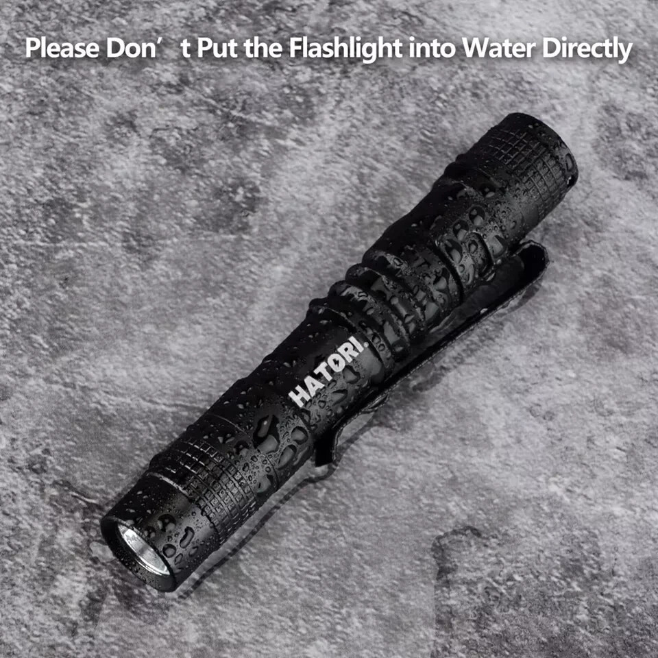 HATORI LED Mini Flashlight, Bright Small Handheld Pocket Flashlights Tactical High Lumens Pen Light for Camping, Outdoor, Emergency, 4 Pack(3.55Inch) ✓ Free 30 Day Returns ✓ Free Shipping ♥♥Ultra Bright: This mini penlight gives out max 150 lumens. Super bright in a dark or lit room and lasts quite two hours with moderate use(keep on) on just one alkaline battery(not included), sufficient to light your way and light small dark spaces. ♥♥Pocket Size: This flashlight is small and light enough to slip into a pocket, backpack or purse. Super Mini size is lightweight and small enough for EDC and fits in the palm of your hand. Only weighting about 30g. ♥♥Clip on Flashlight: With a clip, the pen light could also be used as cap light for your convenience. Easy to clip to your belt, remove it if you don't need it. ♥♥Skid-Proof Water-Resistant Design: Suitable for cycling, hiking, camping and other outdoor activities. Our flashlight set is made of high quality 6061T aluminum alloy with no worried using in rain, snow or emergency situations. ♥♥Safe and Warranty Guarranteed: High-Efficiency and Great Output LED Chip with over charging protection, short circuit protection and reverse connected protection. All of Hatori Flashlights has 100% SATISFACTION GUARANTEE and NO HASSLE 90-DAY MONEY BACK GUARANTEE. Why do you choose to purchase Hatori Flashlight? ●A perfect gift for a father, husband, wife, scout and college student for any occasion. ●Suitable for extreme conditions such as storms, floods, power outages, earthquakes, and natural disasters. ●Purpose: Fishing, hiking, hunting, exploring and even taking the kids out trick-or-treating. ●Quality Guarantee: An extra-hard anodized-aluminum body resists scratching and chipping, maintains a sleek look, and enhances grip. ●Portable and small, this torch is convenient to pack in your bag, pocket, backpack and car compartment Note: ●This led flashlight is too bright to be used to check someone's pupils pocket flash light. Please kindly keep far from eyes. ●If you are not 100% satisfy with the purchase for any reason, don't hesitate to contact us to request a refund or replacement. Specification: Type of flashlight: Tactical light or Mini flashlight ●Size: Pocket-sized but really powerful ●LED Type: CREE XPE ●Color: Black ●Dimension: 90 x 14mm ●Lumen: 150 LM ●Switch: Tail-cap (ON/OFF) ●Waterproof: Yes (But can't put it into water directly) ●Type of Battery: 1 x AAA battery ●Material: Made of 6061T aluminum alloy, which is sturdy and durable enough for long time daily using ●Easy to use: Each flashlight has a tail cap push button switch for simple on and off. Package Contents: ●4 x Mini Flashlight