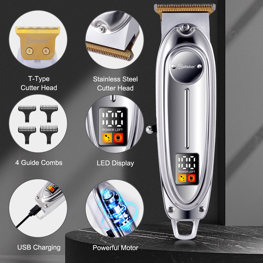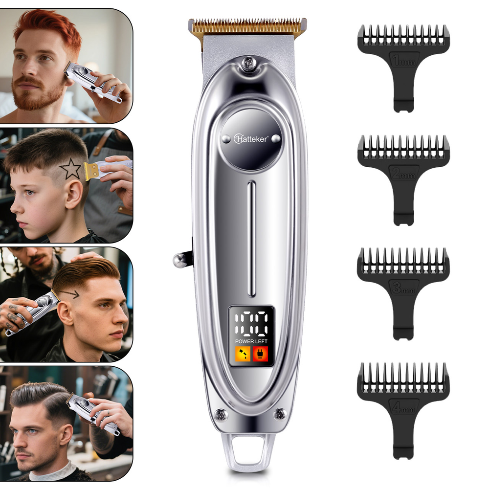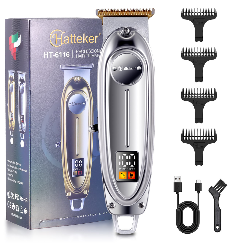 Features: - Professional Trim: Achieve clear, clean lines, dry shaves, and sharp edges with zero blade overlap. Can be used as a hair, beard, sideburns, and beard trimmer. An all-in-one device for all ages. - Powerful: High-torque rotary motors and high-quality machine drive components for a professional-grade shave at home with minimal noise and long-term availability. - Bump-free technology: Provides a dry-trimmed, zero-overlap, ultra-firm, clean shave with a finished T-blade feature that won't cause shaver vibration or irritation. - Sturdy T-Blade: The blade is durable and stays sharp longer than other blades, staying sharp for long periods of time without pulling hair, just like a premium stainless steel blade Product parameters : Brand: Hatteker Model: HT-6116 Product name: hair clipper Color options: Gold/Sliver Charging method: USB charging Battery Weight: 1200 mAh Voltage/Power: 3.7V/5W Weight size: 6.2*1.5inch Use time: 2 hours of charging, 1 8 0 minutes of use Product acessorie s : 1*Host 4 *limiting comb (1/2/3 4 )mm 1*USB cable 1*Cleaning brush If you have any questions, please feel free to contact us, please do not leave any negative feedback, we will deal with it as soon as possible, thank you