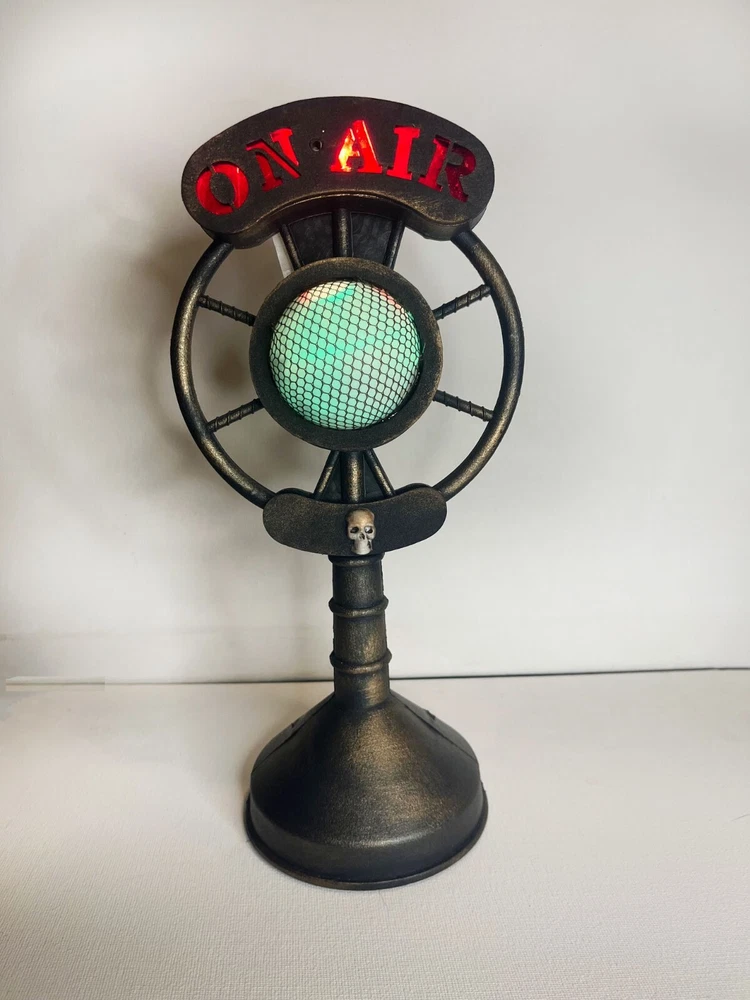 Get ready to add some spooky vibes to your Halloween decorations with this Haunted On Air Radio Halloween Decoration. The microphone prop is perfect for creating a spooky broadcasting station. Light ups and broadcasts creepy spooky messages. Motion activated. Requires 3 AA batteries.