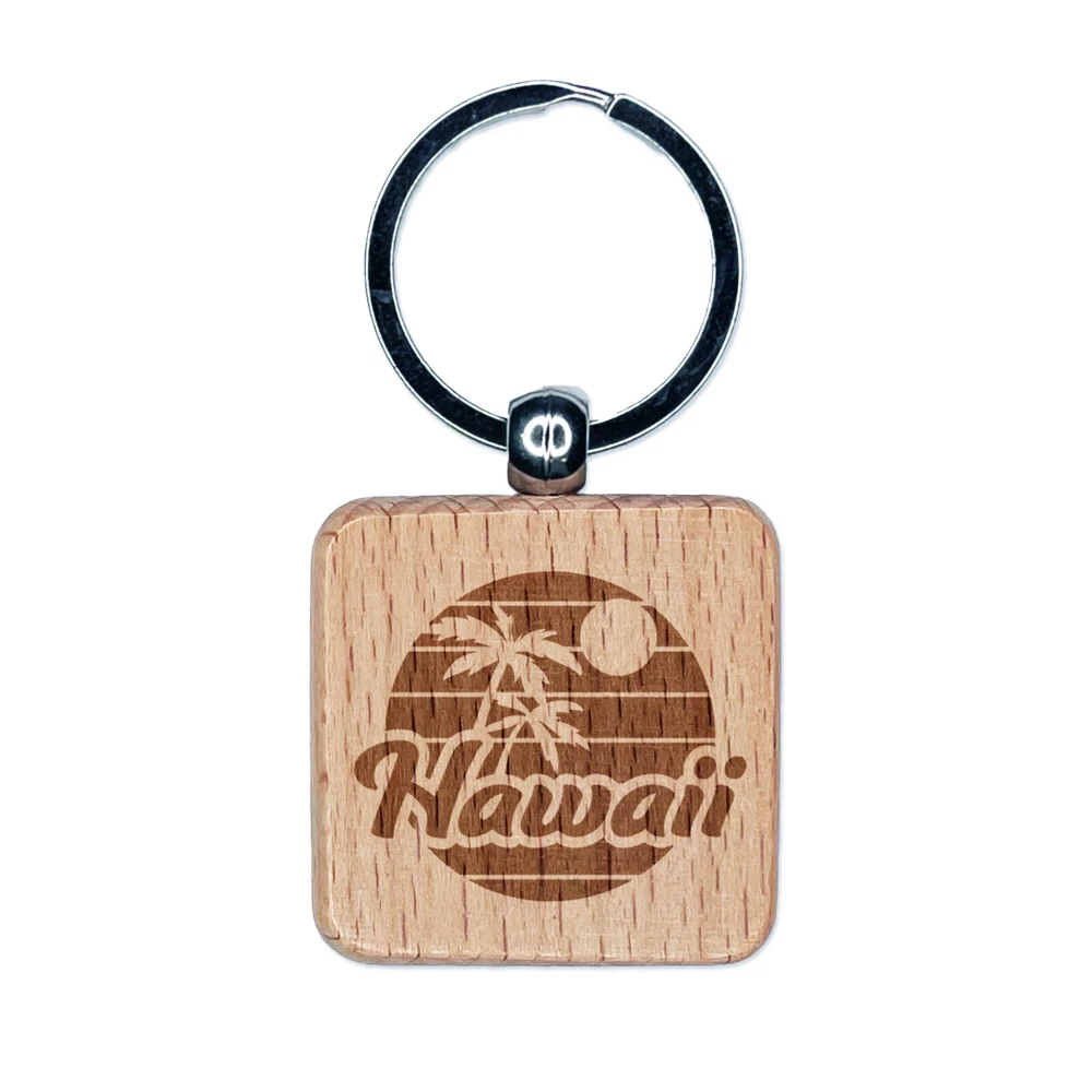 Hawaii Sunset Text with Palm Trees Engraved Wood Square Keychain Tag Charm