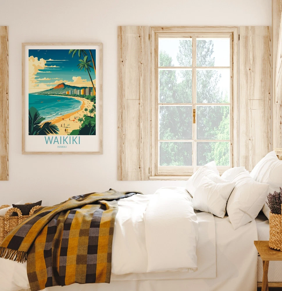 Hawaii Waikiki Travel Poster Waikiki Beach Travel Poster Print Hawaii Waikiki Travel Poster Wall Art Hawaii Coastal Travel Poster Material: Premium luster photo paper Print type: Inkjet printing One side printed + The finish provides the highest possible resolution and color saturation + Lasts up to 200 years in color and 400 years in black-and-white + Printed on high-quality resin-coated photo base paper medium + Posters can be hung with double-sided tape, tacks, or framed + Hand washing with a gentle cry cloth is recommended for extended durability I will hand select the best choice of paper for your chosen design to ensure top quality results for a beautiful, bright and luxurious print. All prints are sealed in cellophane slips for protection during transportation, and are shipped in a protective cardboard envelope.