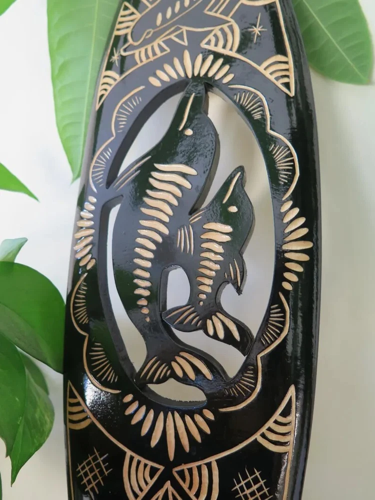 Hawaiian Hand Made 20" Carved Out Wood Surfboard Home Decor Engraved Dolphin
