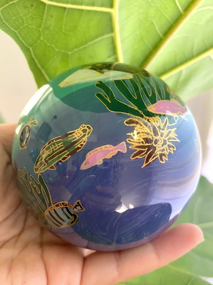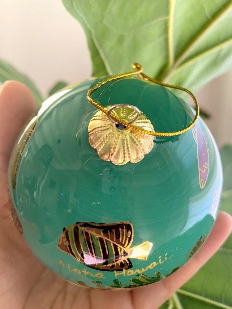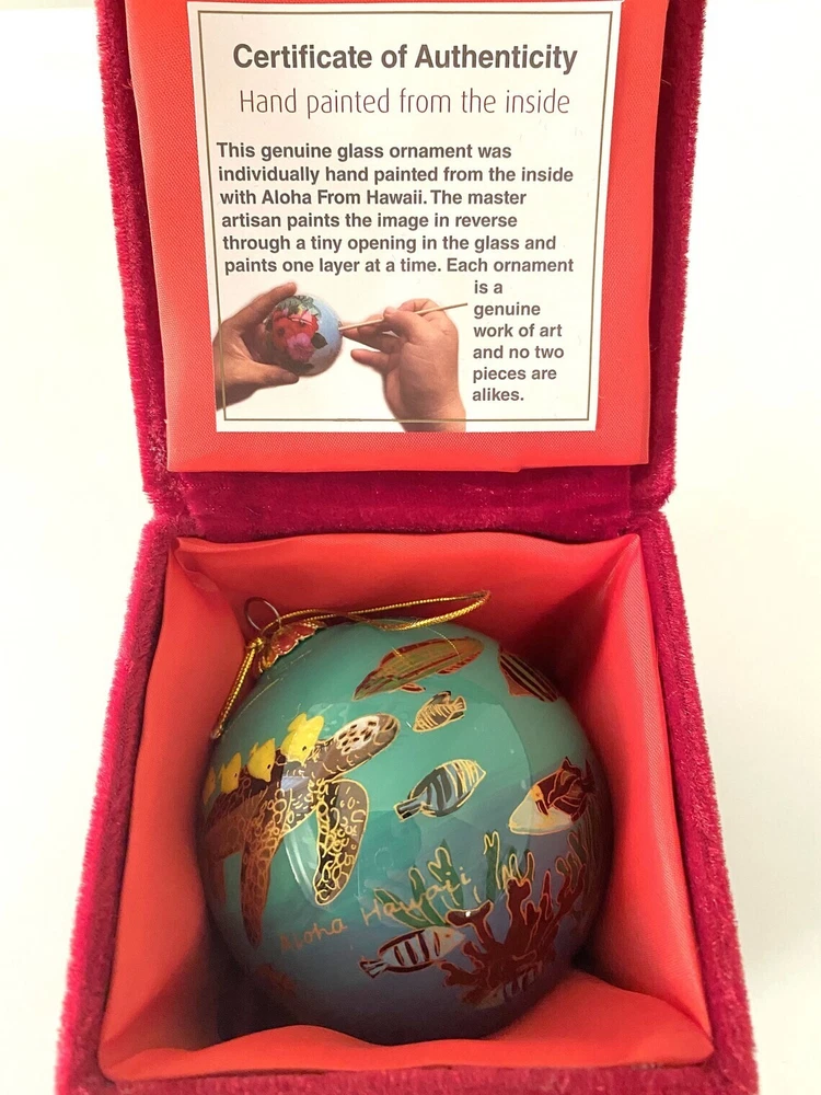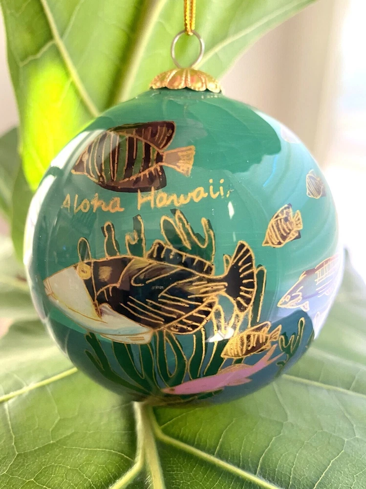 HAWAII STATE FISH / SEA LIFE HAND PAINTED ORNAMENT Our collectible glass Hawaiian State Fish / Sea Life ornament is painstakingly hand painted from the inside of the glass ball. The ornament is 3.5 inches in diameter and comes with a protective gift box that makes it an ideal Hawaii gift and keepsake for anyone who loves Hawaii. #36208-44