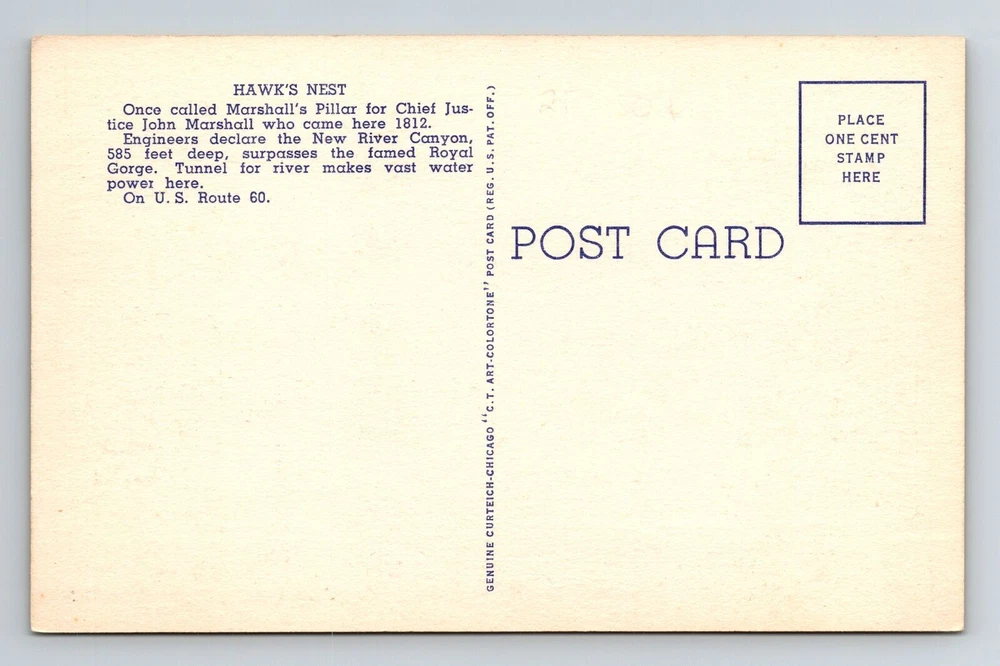 City: Hawk's Nest Rock State Park Postage Condition: See Image Unit of Sale: Single Unit Type: Printed (Lithograph) Era: Linen Country/Region of Manufacture: Unknown Subject: Cities & Towns Original/Licensed Reprint: Original Country: USA Theme: Cities & Towns Region: West Virginia