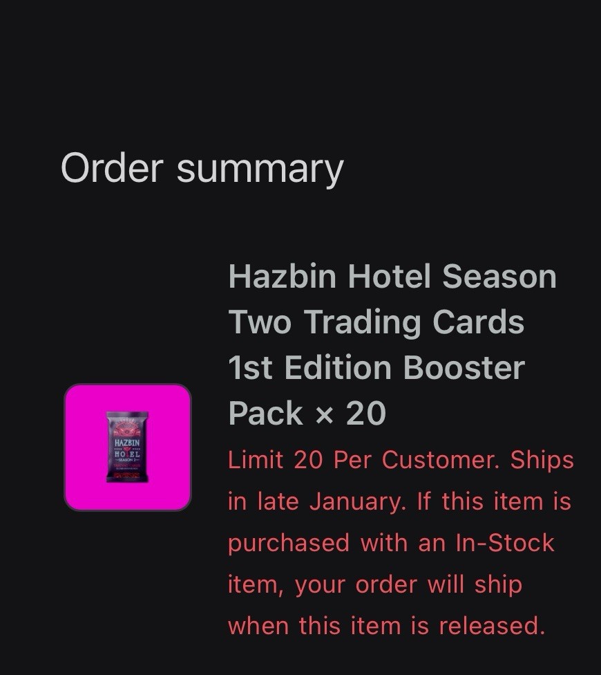 The Hazbin Hotel Season 2 Trading Cards Booster Packs 1st Edition Presale EXCLUSIVE these packs come in English language and are part of the 1st Edition release. Each pack offers a unique chance to collect and enjoy cards featuring characters and elements from the Hazbin Hotel universe. This exclusive presale ensures that collectors can secure these limited edition packs before they sell out. Ships late January. For take all price send a message, thanks! Lot of 10