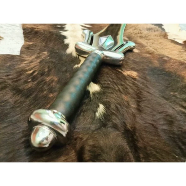 Handcrafted Stainless Steel He-Man Power Sword Replica with Leather Sheath Relive the epic adventures of He-Man with this beautifully crafted Power Sword replica. The sword is handmade with high-quality stainless steel, making it durable and sturdy. It measures 46 inches in overall length and weighs 2.5 kg, giving it a realistic feel. The sword features a silver-colored stainless steel blade with a rat-tail tang and an ambidextrous handle wrapped in leather for a comfortable grip. The handle has intricate details and patterns that add to the overall aesthetics of the sword. The sword comes with a leather sheath that can be used to carry and protect the sword when not in use. The sheath is designed to perfectly fit the sword and has a belt loop that allows you to attach it to your waist. This Power Sword replica is perfect for cosplay, display, or as a collector's item. It's a must-have for any He-Man fan or collector. Specifications: Blade Material: Stainless Steel Handle Material: Leather Overall Length: 46 inches Blade Length: N/A Weight: 2.5 kg Sheath Material: Leather
