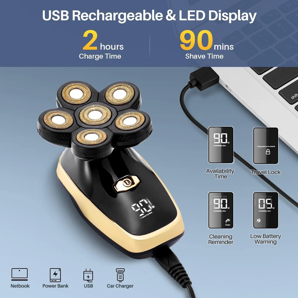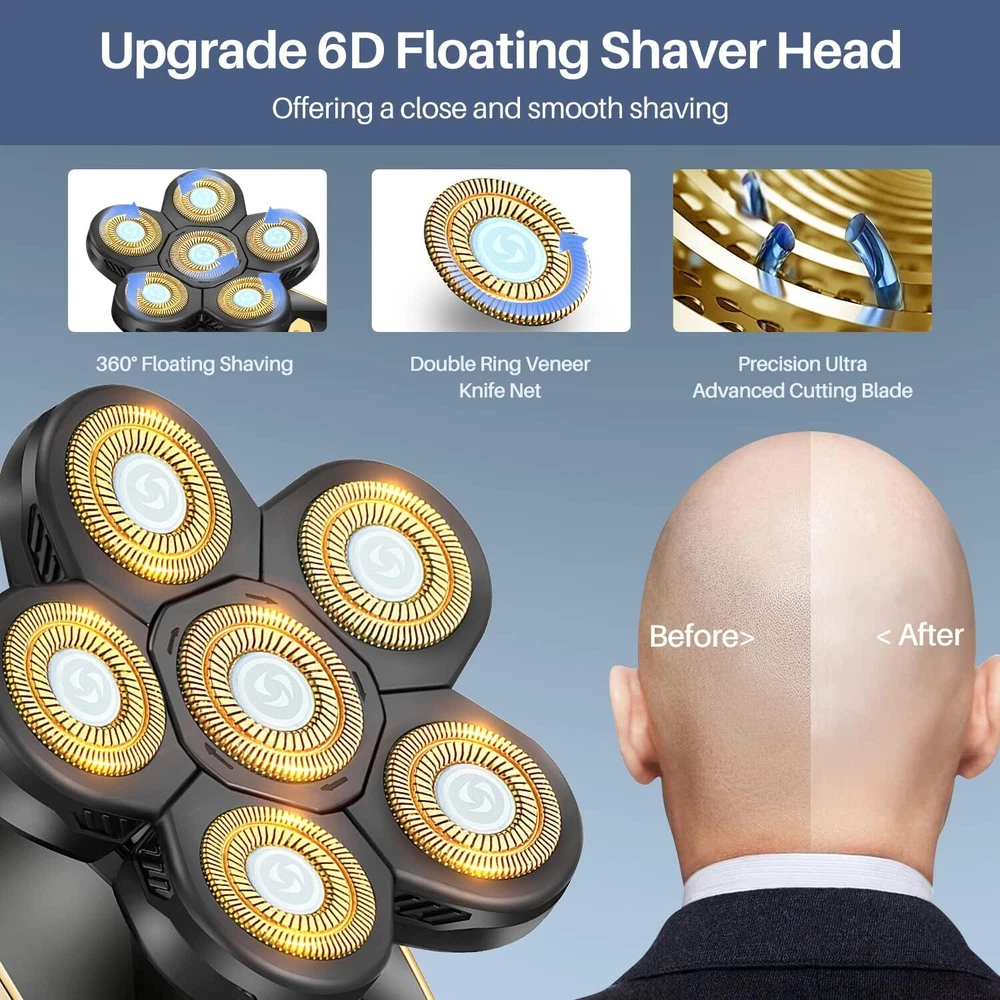 Product Description Head Shavers for Bald Men Rotary Electric Razor Cordless Shaver for Men Multifunctional Electric Razors for Bald Men Waterproof Mens Head Razor Rechargeable Razors for Bald Man 7 in 1 Grooming Kit: This all-in-one grooming set comes with a range of freely interchangeable accessories, such as an electric shaver, two replacement shaving heads, a precision trimmer, a nose and ear trimmer, limit combs (3/5/7mm), a soft facial sponge, a facial cleansing brush and a USB charging cable. It can meet all your daily needs. Professional 6D Floating Razor Head: This razor crafted from ultra-thin alloy material, 6-head rotary shaver is sharper and safer, suitable for all kinds of hair. It has been upgraded with a 6D floating cutter head that better fits the contour of your face for a comfortable and smooth shave, These two extra replacement blades are convenient and financially beneficial - you'll save time and money! USB Fast Charging & Portable: Our bald head shaver are compact and lightweight, this shaver features a built-in high-capacity lithium battery that only takes two hours to charge and provides up to 90 minutes of usage and allows it to be used multiple times on one charge. So you can shave for yourself anytime, anywhere. Intelligent LED Display: An easy-to-read LED display accurately shows the indicated usable time, the shaving usage time, charging reminder and cleaning reminder, so you can monitor the power consumption and the status of the shaver body in real time. The unit also features a 3-second lock function for safe transport and usage. Waterproof Wet & Dry Shaver: Fully washable, this electric razor allows for a dry or a wet shave with shaving foam or gel for a refreshing experience. Making it great for use in the bathroom, accomplishes the trimming task efficiently. About Us We are a reputable seller with many years of experience selling on eBay. Our goal is to provide high-quality products and excellent customer service. Shipping Items will be shipped within 1-3 business days when we received payment. (Orders are not processed on weekends & holidays) Tracking information will be sent once item is shipped. Delivery time depends on destination and other factors Item is shipped to ebay address. Leaving correct address can minimize delay. For international shipping and shipping to Guam, Hawaii and Alaska, Please contact us before placing the order. International buyers please note: Import duties, taxes and charges are not included in the item price or shipping charges. These charges are buyer’s responsibility. We will try our best to reduce the risk of the custom duties. Local pick-up is unavailable at the moment. Contact Us We reply any email messages within 1 business / working days(off-duty at weekend). If you do not get a response from us, then please check your junk or spam mailbox. Our Business hours: Mon-Fri 9:00-18:00, UTC/GMT +8 hours. Please contact us either by clicking "contact seller" in the "purchase history" section or simply click "ask a question" at the bottom of this page. If you are unsatisfied with our item or service, please contact us before leaving any feedback. We are committed to resolve all issues in a friendly and satisfactory manner.