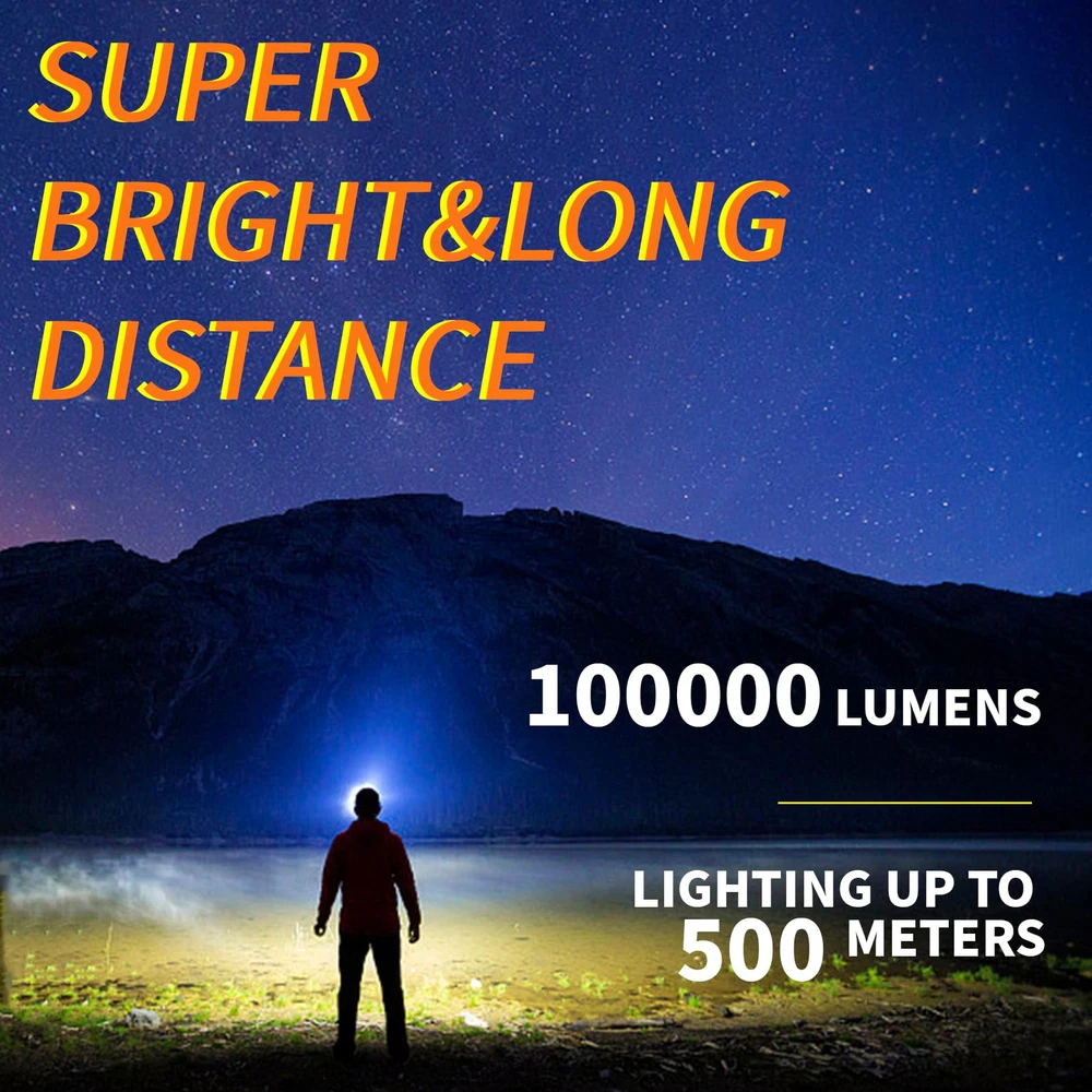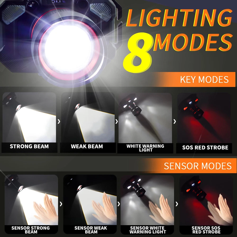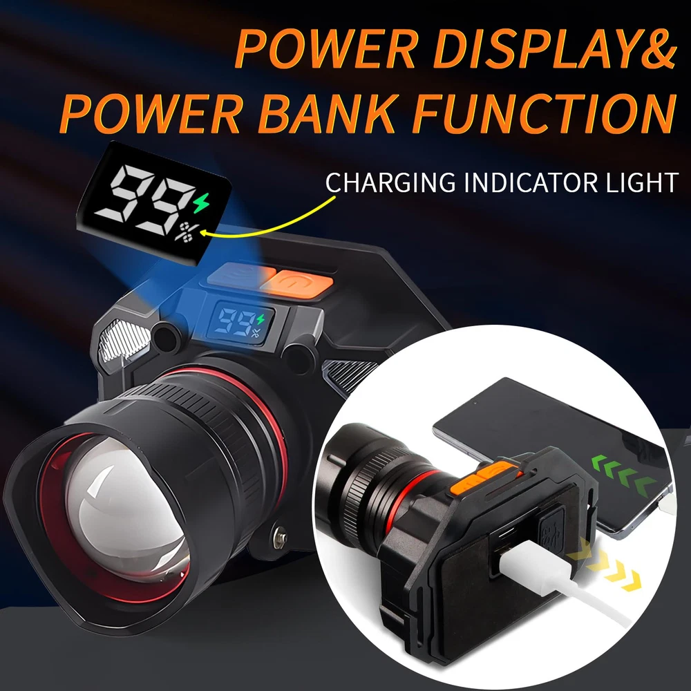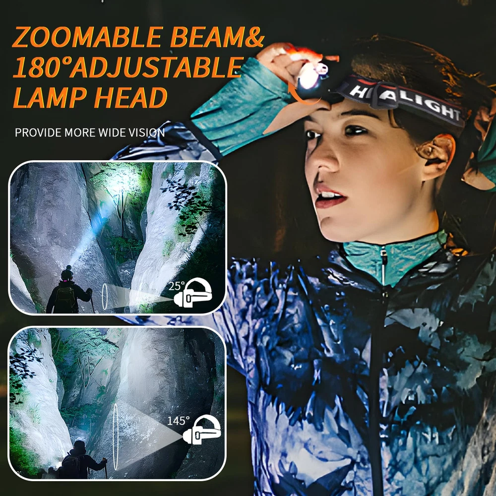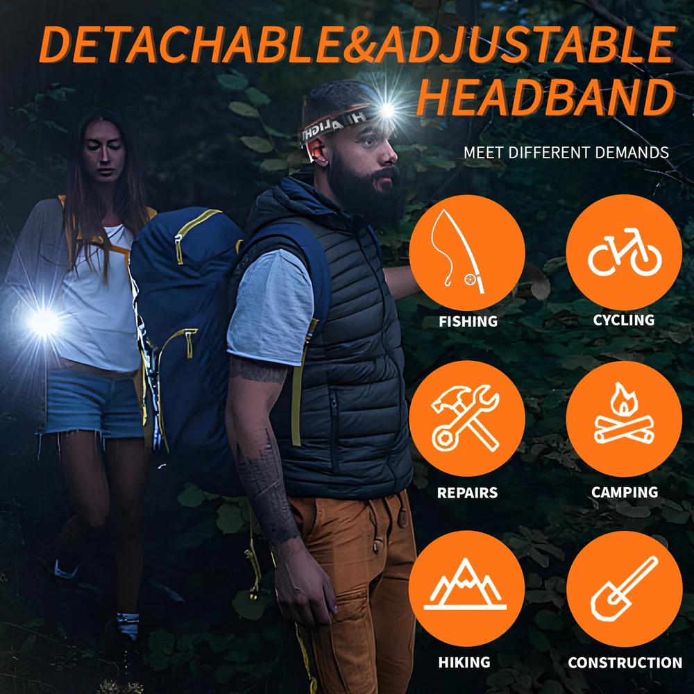 1. Removable Headband: The headlight made of 100% IPX4 waterproof rate materials, it is more sealed, suitable for rain or snow; Comfortable elastic headband, which can easily disassemble and adjust it is the best headlamp choice for outdoor activity 2. Power Display: Our led headlamp with digital display screen, helps you keep track of battery usage, include high beam, low beam, white strobe and red strobe etc 8 different working options, ensure that you can receive stable lighting in any environment 3. Power Bank Design: 2500 mah large capacity build-in battery can be used as an emergency charging bank for your phone and other device, provide you with courage and protection during the adventure process 4. Adjustable Focus And Head: The 100000 lumens rechargeable headlamp's head can 180°spin up and down, illuminate to 500 meters area; Focus adjustment function can achieve145°flood light mode and 25°spot light mode only through push-pull lens 5. Long Press Off Mode: Unlike the most market head light, led headlights has added a long press function, in any mode, if you hold the key mode button for 3 seconds, you can turn off the light directly, no longer need to cycle all modes 6. Motion Sensor Function: It also added motion sensor function mode, you can easily turn the lights ON or OFF by waving your hand, which is more convenient and avoids soiling head lamps when you hand is dirty or the environment is harsh