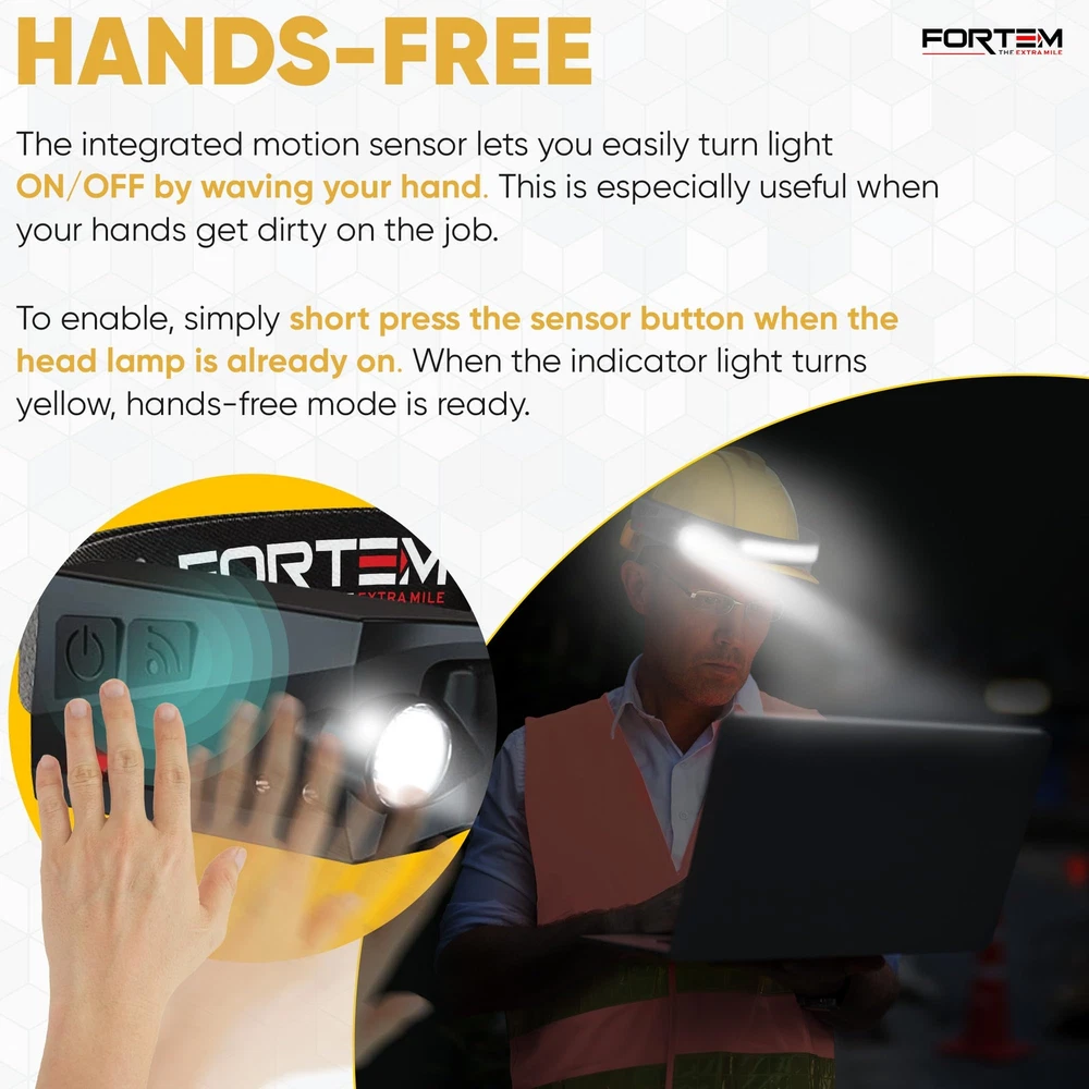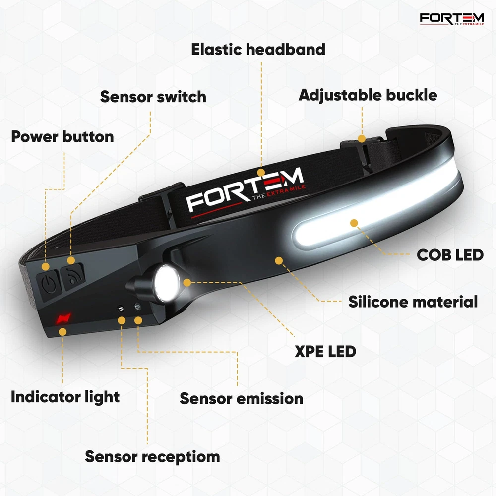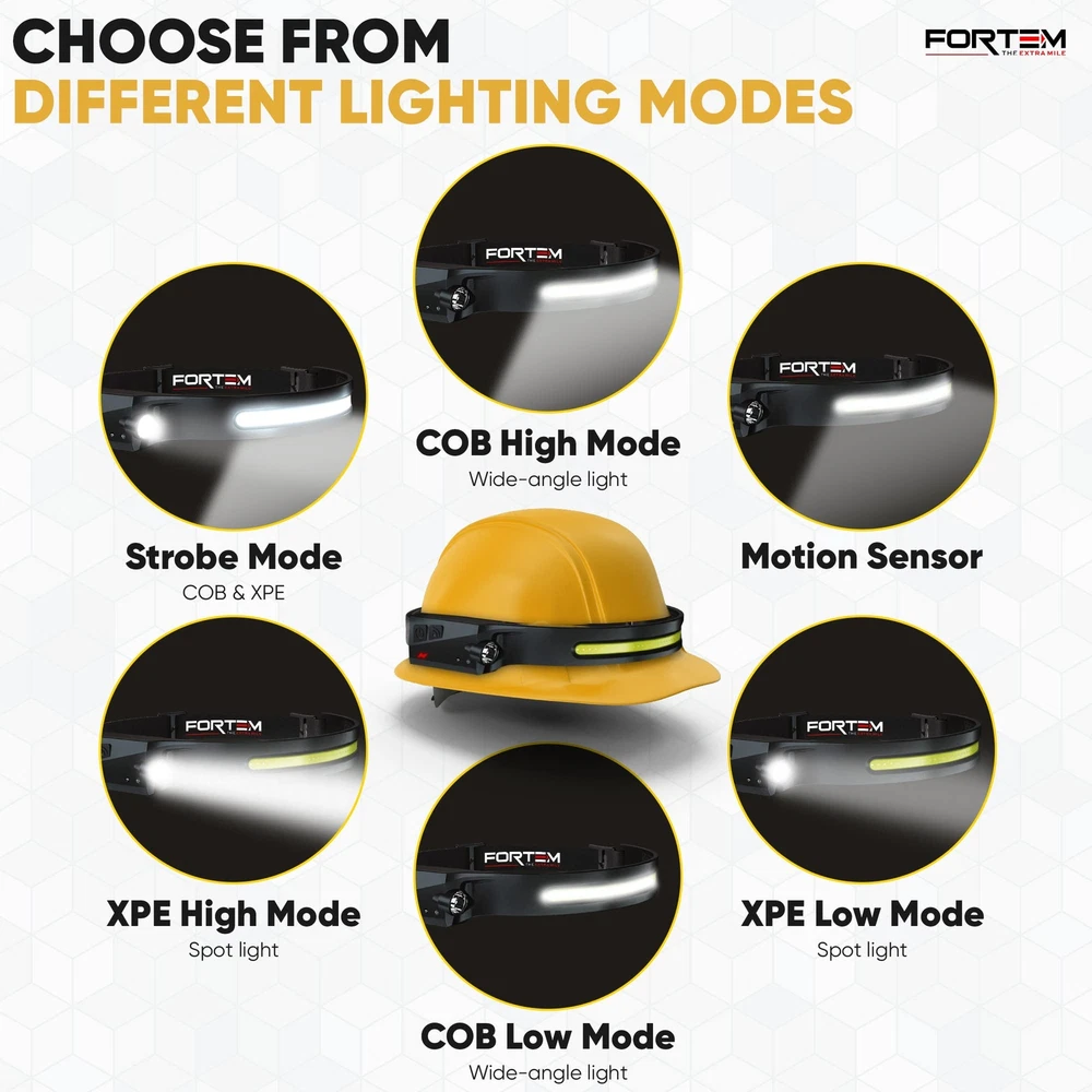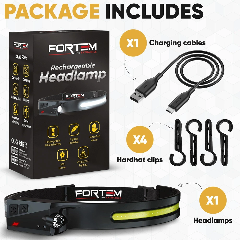 Headlamp - the ultimate lighting solution for all your outdoor adventures and indoor activities. With its powerful and durable design, this headlamp is the perfect accessory for hikers, campers, runners, and anyone in need of hands-free illumination. This unit features a high-quality XP-E spotlight and COB LED strip that delivers up to 300 lumens of brightness, providing a wide and even beam that illuminates your path and surroundings with ease. Designed with comfort and convenience in mind, this headlamp features an adjustable headband that fits comfortably on most head sizes and shapes. The lightweight and compact design of the Headlamp make it easy to carry around and store when not in use, making it an ideal choice for backpackers and travelers. The Headlamp is also incredibly durable, with a tough and water-resistant exterior that can withstand harsh weather conditions and rough handling. Rechargeable with provided USB-C charging cable, providing long-lasting performance that won't let you down when you need it most. Whether you're exploring the great outdoors, working on home repairs, or reading in bed, the Headlamp is the perfect lighting solution for all your needs. With its powerful performance, durable design, and comfortable fit, this headlamp is sure to become your go-to lighting accessory. 1 PACK – There is (1) LED headlamp rechargeable units included along with a charging cables and 4 hard hat clips. light headband is the head lamp to wear or take with you to work every day. VERSATILE HEADLIGHT FLASHLIGHT - rechargeable headlamp features a 230-degree COB LED & spotlight XPE light, offering SIX different light modes for various activities. Works as a camping headlamp, outdoor hiking headlamp, hunting headlamp, hardhat headlamp, running headlamp, fishing and more. HANDS-FREE DESIGN - The battery powered head lamp frees your hands to work on tasks, making it an ideal headlight for both outdoor adventurers and hands-on jobs. Head lights for forehead help illuminate exactly what you’re looking at. The Hands-free mode allows you to turn this bright headlamp on and off by simply waving your hand near the sensor. RECHARGEABLE BATTERY: This LED headlamp for head provides even more convenience with a rechargeable battery, that eliminates the need to replace batteries. High lumen headlamp flashlight contains a 1200mAh battery allowing your head torch to last up to 8 hours depending on light mode used. Easily recharge within 2 hours with USB-A to USB C cable. SUPER BRIGHT HEADLAMP: Headlamps for adults rechargeable ensures optimal visibility in the darkest environments. The COB mode’s high power 350 Lumen brightness and 230-degree range are unmatched.