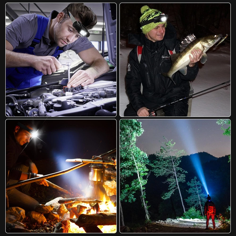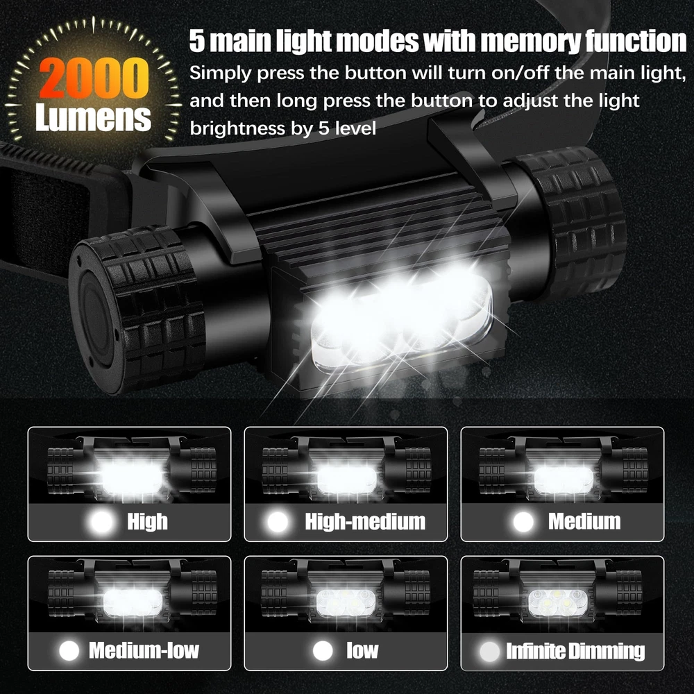 9 lighting modes: This rechargeable headlamp features a high-intensity LED chip that can provide a maximum output of 2000 high lumens and includes 9 lighting modes, including 5 different brightness levels, moonlight mode, and 3 emergency lighting modes - strobe, SOS, and beacon - to meet your different needs. Switching between modes is easy with the press of a button. The headlamp can be adjusted up and down by 180 degrees, with a wide 120-degree illumination range to light your way anytime. Rechargeable LED headlamp: Built-in with a 2600mAh high-capacity rechargeable battery, this headlamp has a long lifespan and supports multiple charging methods, including a hidden TYPE-C charging port that can be charged using a mini USB charging cable (included in the package), making it compatible with laptops, power banks, car chargers, and wall sockets. The red light will turn on while charging and will turn green when fully charged. It can last up to 8 hours after a full charge. Easy to use: With a simple on/off switch, you can easily turn the headlamp on and off without having to go through all the lighting modes. A long press of the switch for 3 seconds can adjust the headlamp to one of five different brightness levels. Quickly pressing the switch twice can activate the emergency lighting modes, and pressing it twice continuously can adjust it to different emergency lighting modes. When the headlamp is off, a long press of the switch can activate the moonlight mode. Versatile application: The adjustable and detachable design of this headlamp makes it perfect for various activities, such as running, camping, repairing, fishing, biking, hiking, and dog walking. Besides its primary use as a headlamp, it can also be used as a handheld flashlight or magnetically attached to metal surfaces for emergency or repair lighting. It can also be used as a safety helmet lamp in industrial settings, making it an essential item for every household. High-quality headlamp: The headlamp body is made of high-strength aluminum material, which is lightweight yet durable. It has undergone four layers of polishing and is combined with a wear-resistant paint layer and a unique hidden charging design. This headlamp is impact-resistant, waterproof, dustproof, and has an IP66 waterproof rating with a built-in circuit protection design that ensures a longer lifespan, providing you with convenience and safety in your daily life.
