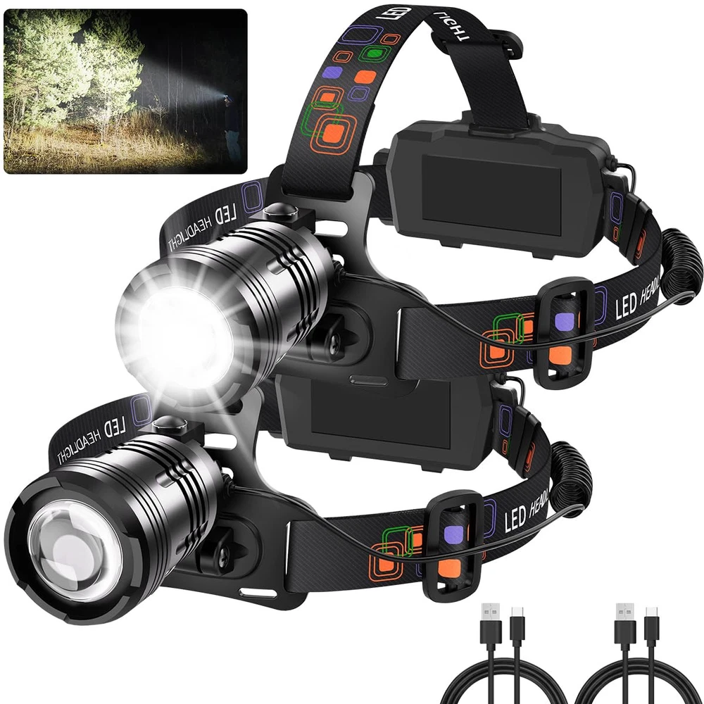 Super Bright & 4 Lighting Modes: rechargeable headlamp is equipped with advanced LED bead and upgraded light chip to provide ultra-high lighting brightness, including 4 working modes: high mode, low mode, strobe mode and SOS mode. The LED headlamp can be used in a variety of lighting scenarios such as fishing, hiking, camping, and emergencies. Adjustable Focus & 90°Angle Rotation: By stretching the focal length of headlamps, the zoom function allows the head lamp to switch between long-distance spotlight and wide-beam floodlight. In addition, the head of the head lamp can be flexibly adjusted within 0-90°, ensuring that you can choose the optimal lighting angle for different needs. Rechargeable & Power Indicator: Equipped with high-capacity batteries, rechargeable headlamp can achieve a long working life for 3-8 hours, and can be used outdoors continuously, solving the problem of charging frequently. Besides, the power indicator on the back battery pack can accurately reflect the working state and power level of head lamps. Comfortable & Special Designs: The headlight design of lightweight body and highly elastic headband reduces the pressure on the head, so you will feel comfortable while wearing the head light. The head lights for forehead are made of high-grade aluminum alloy and have a special shape, which can perform a specific function in case of emergency. Package List & After-Sales Service: Headlamp kit includes 2* powerful headlamp, 4* rechargeable battery, 2* type-c charging cable, 1* instruction manual and 1* packing box. If you have any problems with headlamps, such as broken package, lack of accessories, not working, please contact us by Amazon, we will respond you and solve your issue within 24hrs. offers a 365-Day New Item Exchange Policy for any product quality issues.