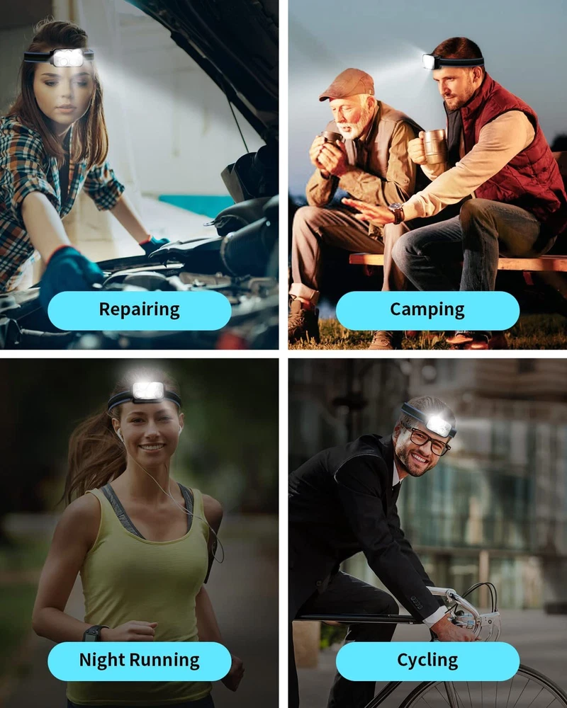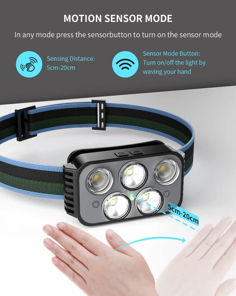 Note: No direct shining on eyes of people or animal, which may cause instant blindness Super Bright & Incredible Value - Headlamp flashlight uses a best-in-class LED chip with a 400-lumen beam wide variety of white & red light modes that can instantly illuminate the surroundings in a dark environment. it can meet all your outdoor lighting needs. Rechargeable Headlamp - Built in 1000mAH large batteries with Type-A USB connectivity. Charge fully only 3 hours. The battery indicator will help you master battery usage. The USB cable is with any USB charger interface. Such as wall charger, power bank, PC etc.( Last for 3-5 hours after full charge.) 6 modes and motion sensor - rechargeable headlamp can switch between Strong White Light, Weak White Light, Strong COB Sidelight, Weak COB Sidelight, Red COB Sidelight, SOS Red Sidelight, which is suitable for running, camping, cycling, fishing and climbing. These modes can be switched with a wave of the hand in front because there are motion sensors built in. Ultra-light and Adjustable - The hand-free headlamp is only weight 2.9 OZ, comfortable and lightweight. The lamp head can be rotated 60° and tightly fixed to avoid shaking and sliding when running. The head flashlight uses comfortable elastic headband, which can easily adjust the length to perfectly fit your head size, perfect for adults and . Intimate after-sales and Risk-free purchase: We will provide a 1-year quality and a 60-day full .If you have any questions, please let us know and our team will reply you within 24 hours.