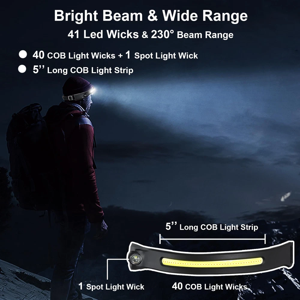 [ 230° Wide Beam & Long-Distance ] LED headlamps with COB strip floodlight can provide 230° wide angle lighting, which allows you to light up the viewing area without moving the head. Equipped with super bright XPE light on the side, headlamp rechargeable can be used as a spotlight to illuminate a distance of nearly 300 feet. [ Motion Sensor & 5 Light Modes ] Head lamps have 5 working modes, including COB high mode, COB low mode, XPE high mode, XPE low mode, and strobe mode to meet all scenarios. The head lamp has sensitive motion sensor, so that you can press the sensor mode button and turn the head flashlight on or off with a wave of your hand. [ Rechargeable & Large Capacity ] Rechargeable headlamp has a built-in 1600mAh high-capacity lithium polymer battery, ensuring long-term use and avoiding the need for constant recharging. LED headlamp rechargeable can be used for 4 - 10 hours in different light modes, and can be fully charged in 2 - 4 hours by the USB C charging cable. [ Lightweight & Adjustable ] Headlights for foreheads rechargeable weight only 2.47 ounces. Headlights for heads can be folded up and placed in your pocket at any time, and you can adjust the elastic headband of the headlight to suit your needs. [ Waterproof & Outdoor ] Head lamps outdoor with IPX4 waterproof can be used safely on rainy or snowy days, making it a great partner for camping, fishing, hiking, and running. If you have any other questions about headlamps for adults, please click “GET HELP WITH ORDER” under your order ID, and we will solve your problem within 24hours.