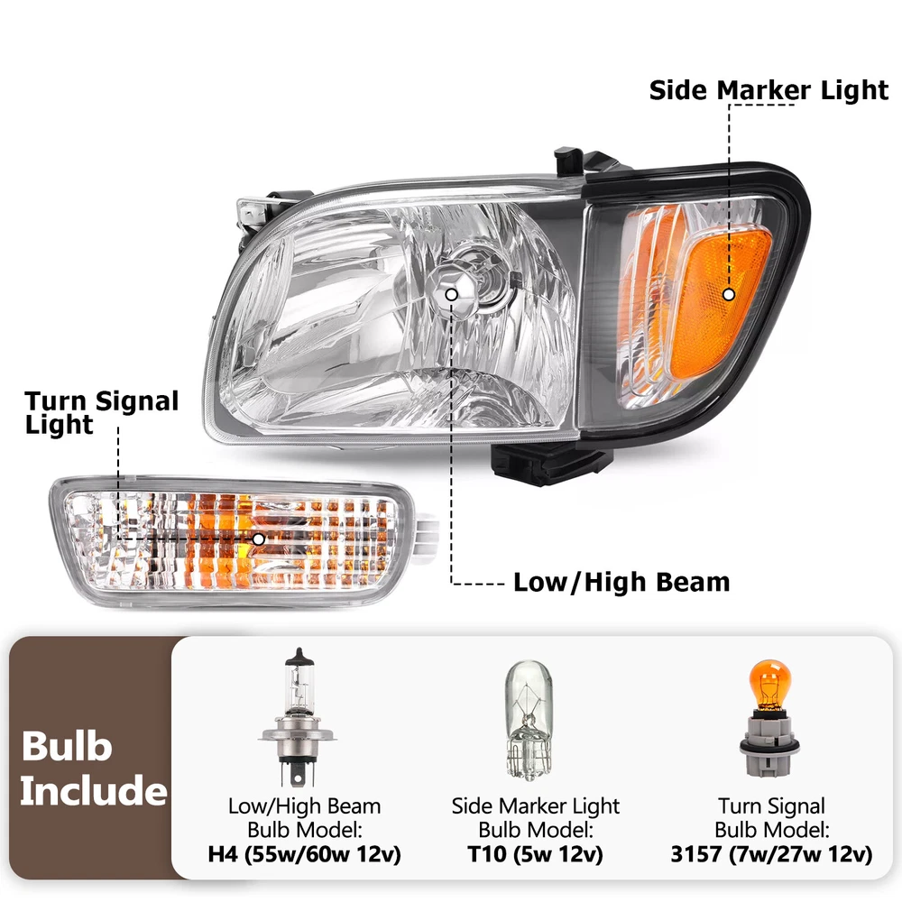 FIT FOR: For Toyota Tacoma 2001-2004 Specification : Condition: 100% Brand New Type: Headlight + Corner Light + Turn Signal Light Color:Clear Lens+Black Housing/Clear Lens+Chrome Housing/Smoke Lens+Black Housing Material: Plastic + Electroplating Installation Method:Screw-On Lighting Technology:Halogen Placement on Vehicle:Front,Left,Right Headlight Replace For 8111004110,8115004110,TO2503136,TO2502136. Turn Signal Light Replace for 8152004080, TO2530140, 8151004080, TO2531140. Corner Light Replace for TO2520160, TO2521160, 8162004070, 8161004070. 8162004090C0, TO2520163, 8161004090C0, TO2521163. Features: Made of high-quality materials: wear-resistant, corrosion-resistant, waterproof and sealed, it can cope with bad weather very well. Energy-saving and environmentally friendly: low energy consumption, high brightness, to ensure your travel safety. Package Includes : The same as your chosen This is a multiple choice link, please confirm the item you need before purchasing. Shipping: All items will be shipped out in 1 business day, no expedited service available. We ship our items to USA only(Does NOT include Hawaii, Alaska or Puerto Rico, PO Boxes/APO's). Shipping Notes: We use multiple warehouses and will select the nearest warehouse for delivery according to your order address and our inventory, Thank you for your cooperation. Contact us: Any Questions, Just feel free to contact us on eBay. We will reply you in 24 hours. On Dec 13, 2024 at 18:35:31 PST, seller added the following information: