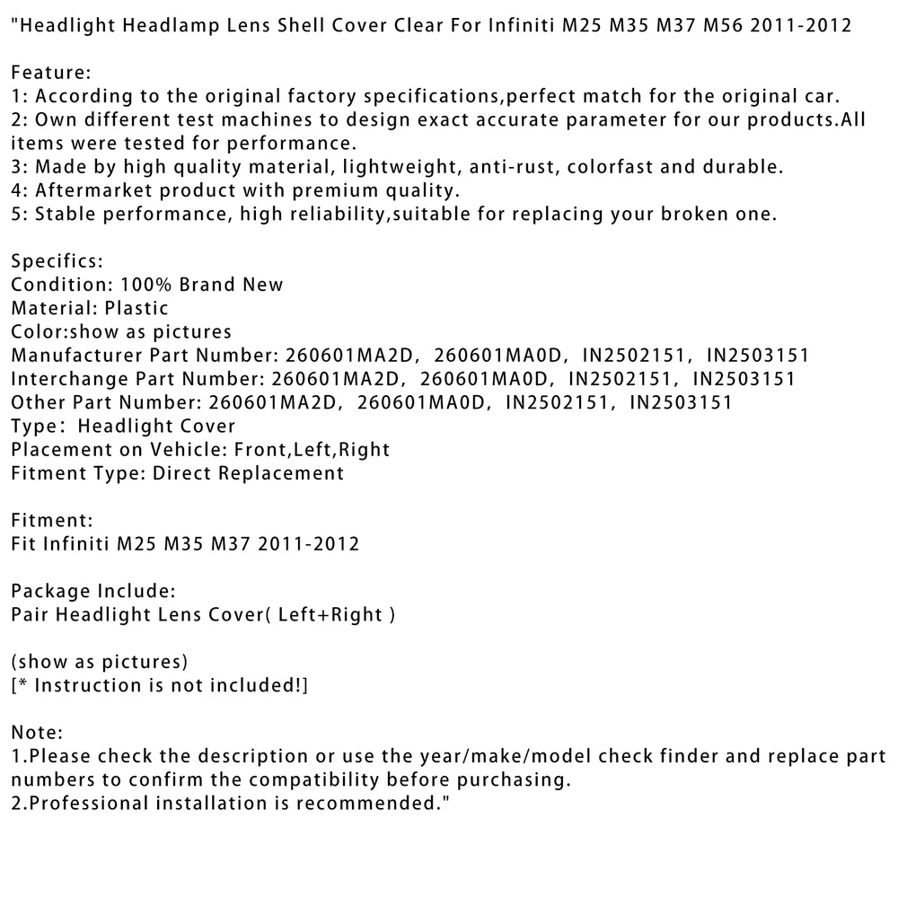 NEW-00004 Headlight Headlamp Lens Shell Cover Clear For Infiniti M25 M35 M37 M56 11-2012 U DESCRIPTION Headlight Headlamp Lens Shell Cover Clear For Infiniti M25 M35 M37 M56 2011-2012 Feature: 1: According to the original factory specifications,perfect match for the original car. 2: Own different test machines to design exact accurate parameter for our products.All items were tested for performance. 3: Made by high quality material, lightweight, anti-rust, colorfast and durable. 4: Aftermarket product with premium quality. 5: Stable performance, high reliability,suitable for replacing your broken one. Specifics: Condition: 100% Brand New Material: Plastic Color:show as pictures Manufacturer Part Number: 260601MA2D,260601MA0D,IN2502151,IN2503151 Interchange Part Number: 260601MA2D,260601MA0D,IN2502151,IN2503151 Other Part Number: 260601MA2D,260601MA0D,IN2502151,IN2503151 Type:Headlight Cover Placement on Vehicle: Front,Left,Right Fitment Type: Direct Replacement Fitment: Fit Infiniti M25 M35 M37 2011-2012 Package Include: Pair Headlight Lens Cover( Left+Right ) (show as pictures) [* Instruction is not included!] Note: 1.Please check the description or use the year/make/model check finder and replace part numbers to confirm the compatibility before purchasing. 2.Professional installation is recommended. About Us Shipping Terms Of Sale Contact Us Areyourshop has committed to do our utmost to serve more vehicles models with the most competitive products both in price and service, including headlights, foglights, taillights,headlight assembly, etc., aiming at the largest group of customers. Paired with our fast shipping and satisfaction guarantee, we’re able to ensure that all the customers can get the product when they need it. Customer Satisfactory 1.We back our commitment with superb service, 100% full money back and a customer satisfaction guarantee. 2.I am here and ready to assist you with any questions or concerns you might have before or after the purchase. 3.My goal is to make sure you are a happy customer and pleasant shopping with us. Feedback If you are satisfied with the purchase and our total service, your comment is very important in our business success. Please take a minute to leave us a positive feedback with an overall Detailed Selling Rating (DSR) of 5. Our eBay account setup auto feedback, so eBay system gives you automatically Positive feedback back after your positive feedback left. If you plan to give us a neutral/negative feedback Or open ebay/paypal case, please write to us immediately so that we can do our best to resolve your problem. United States Buyers Parcel will via USPS or UPS from us United States warehouse Shipping Time Usually ,Parcel will be delivered 2-7 working day include Handling time. Sometimes shiping time may has a little delay, such as Bad wether,Holidays We stand behind everything that we sell and will do everything possible to assure you are satisfied. When you receive your purchase if you are not 100% satisfied, please sent me ebay message and we will do our best to make you happy. If you still want to return your purchase, simply ship the item(s) back to us and we will refund your original purchase price and the original shipping charge. Buyers are responsible for the postal cost of returning the items. We must be notified of the intent to return your item within 30 days of receiving the item. Items returned must be in the same condition that they were received. How to return 1,Please ask us for return address . 2,Shipping back the package . The RMA#(Return Merchant Authorization Number = Your ebay ID) must be clearly written on the return package ,Otherwise the package will be refused. 3,Sent us the return tracking number. 4,All returns will be inspected prior to a credit being issued. If you have any questions, welcome to send us ebay message. We strive to answer all questions and resolve any problems as quickly as possible. Business Hours: HongKong Time GMT+8:00 Monday-Saturday 9:00-17:00 About Us About Item All items sold by us are being described to the best of our abilities, as accurate as possible, and with utmost conscientiousness on our part. However, to avoid any potential oversights, I respectfully request your assistance in helping us to make this a mutually satisfactory transaction by THOROUGHLY reviewing item description and photos, and asking all questions PRIOR TO BIDDING. Customer Satisfactory 1.We back our commitment with superb service, 100% full money back and a customer satisfaction guarantee. 2.I am here and ready to assist you with any questions or concerns you might have before or after the purchase. 3.My goal is to make sure you are a happy customer and pleasant shopping with us. Feedback If you are satisfied with the purchase and our total service, your comment is very important in our business success. Please take a minute to leave us a positive feedback with an overall Detailed Selling Rating (DSR) of 5. Our eBay account setup auto feedback, so eBay system gives you automatically Positive feedback back after your positive feedback left. If you plan to give us a neutral/negative feedback Or open ebay/paypal case, please write to us immediately so that we can do our best to resolve your problem. Shipping United States Buyers Parcel will via USPS or UPS from us United States warehouse Shipping Time Usually ,Parcel will be delivered 2-7 working day include Handling time. Sometimes shiping time may has a little delay, such as Bad wether,Holidays Terms Of Sale We stand behind everything that we sell and will do everything possible to assure you are satisfied. When you receive your purchase if you are not 100% satisfied, please sent me ebay message and we will do our best to make you happy. If you still want to return your purchase, simply ship the item(s) back to us and we will refund your original purchase price and the original shipping charge. Buyers are responsible for the postal cost of returning the items. We must 