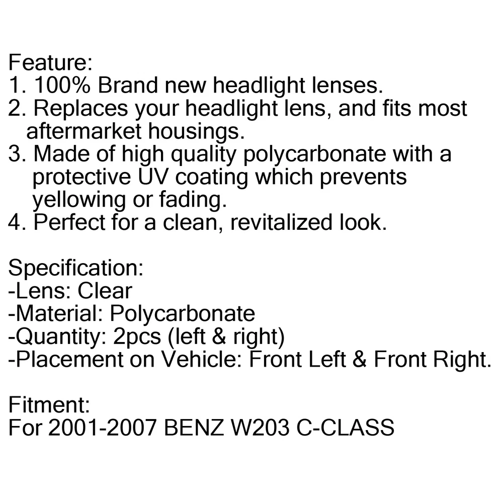 You may also like For Philips 12188NAC1 Car Standard Auxiliary Bulbs PSY24W 12V24W PG20/4 M2 18.85 USD Free shipping For Philips 11067CU31B1 Ultinon Pro3100 LED-WHITE W16W 6000K W2.1x9.5d 19.85 USD Free shipping For GE General Lighting Halogen Headlight 58520U H7 12V55W PX26D 12.85 USD Free shipping 2Pcs H9 For OSRAM 5000K Cool Blue Hyper+ Plus White Light Halogen Bulb Globe 44.85 USD Free shipping Right LED DRL Light Control Unit 63117214940 For BMW 5 Series G30 G38 2017- 32.85 USD Free shipping 2x For OSRAM 9705Y Car Auxiliary Bulbs LED WY21W 12V2.5W WX3x16d M2 26.85 USD Free shipping Left Xenon Headlight AFS Cornering Module 7L6941329 For VW Passat 63.85 USD Free shipping For Philips 11066RU31B2 Ultinon Pro3100 LED-RED W21/5W W3x16d 12V 23.85 USD Free shipping A2189009103 LED Turnlight Control Module For Benz W204 C class 2012-2014 63.85 USD Free shipping Headlight Ballast Control Module Unit A2059009534 For Mercedes C E CLS G 139.85 USD Free shipping For TOSHIBA TAC8W Car Auxiliary Bulbs 31MM C8W 12V8W Festoon Lamp M2 10.31 USD 10.85 USD Free shipping 5% off H8 For`Philips CoreDrive Halogen Fog 12360CDC1 12V 35W PGJ91-1 M2 13.85 USD Free shipping Feature: 1. 100% Brand new headlight lenses. 2. Replaces your headlight lens, and fits most aftermarket housings. 3. Made of high quality polycarbonate with a protective UV coating which prevents yellowing or fading. 4. Perfect for a clean, revitalized look. Specification: Lens: Clear Material: Polycarbonate Quantity: 1pcs (left&Right) Placement on Vehicle: Front Left&Right Fitment: For 2001-2007 BENZ W203 C-CLASS C230 | C240 | C280 | C320 | C350 | C32 AMG Note: Just For 4-DOOR SEDAN | 4-DOOR WAGON ,Not fit 2-Door -About US Founded in 2012, VIPJQ have professional development and sales, and are involved in various products, providing customers with various high-quality products. Since its establishment, VIPJQ has always adhered to the service concept of "customer first" and the management concept of "pursuit of quality", and is committed to providing customers with high-quality original designs. We commit to provide you the best innovative, quality products & professional services with competitive prices. We value every customer, and we look forward to providing solutions for your business needs to help your business achieve its goals, please contact us immediately! We are all about you! We are a Japanese seller,but with large warehouse in USA. We are profesional on Auto Parts,Car Parts,Motorcycle Parts,3C,other hot sale items and so on. We aim to provide to customers high quality product and best service. -About Shipment&Returns The item usually will be dispatched within 3 days after you ordered.All are free shipping. And it usually takes 3-10 working days to delivery depends on buyers' address or other majeure on the way. If you are not satisfied with the items and want to return the item,we hope you could message us first,we will give you the return details, we think we could give you the best service to save your time and money.Thank you. -About Feedback&Customer Service If you are enjoy your shopping here,not only enjoy the items but also the service,we are appreciate you could give us a 5-star feedback. If you are not satisfied with the item,before you give us the negative feedback,we hope we could give you the best solution through our commutication. We think we could do it if you give us the chance.Thank you.