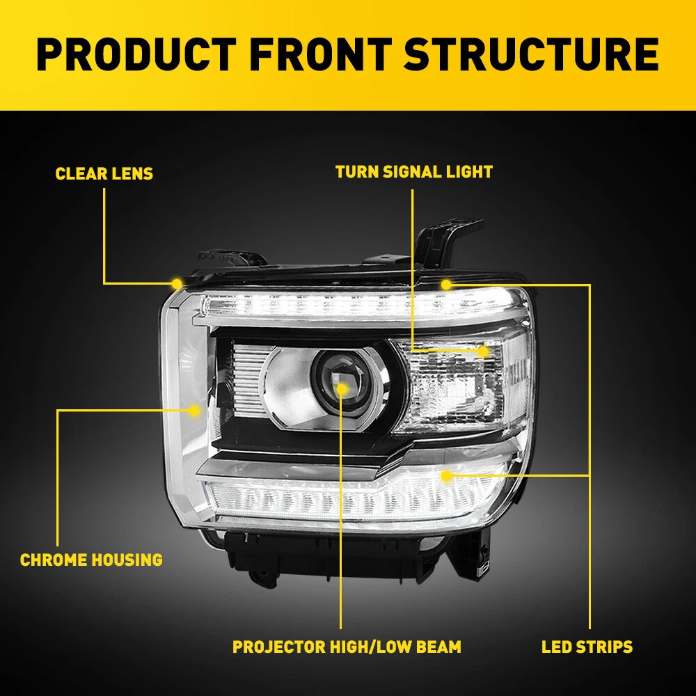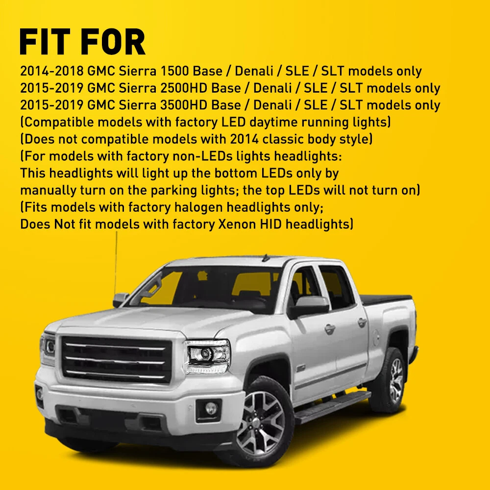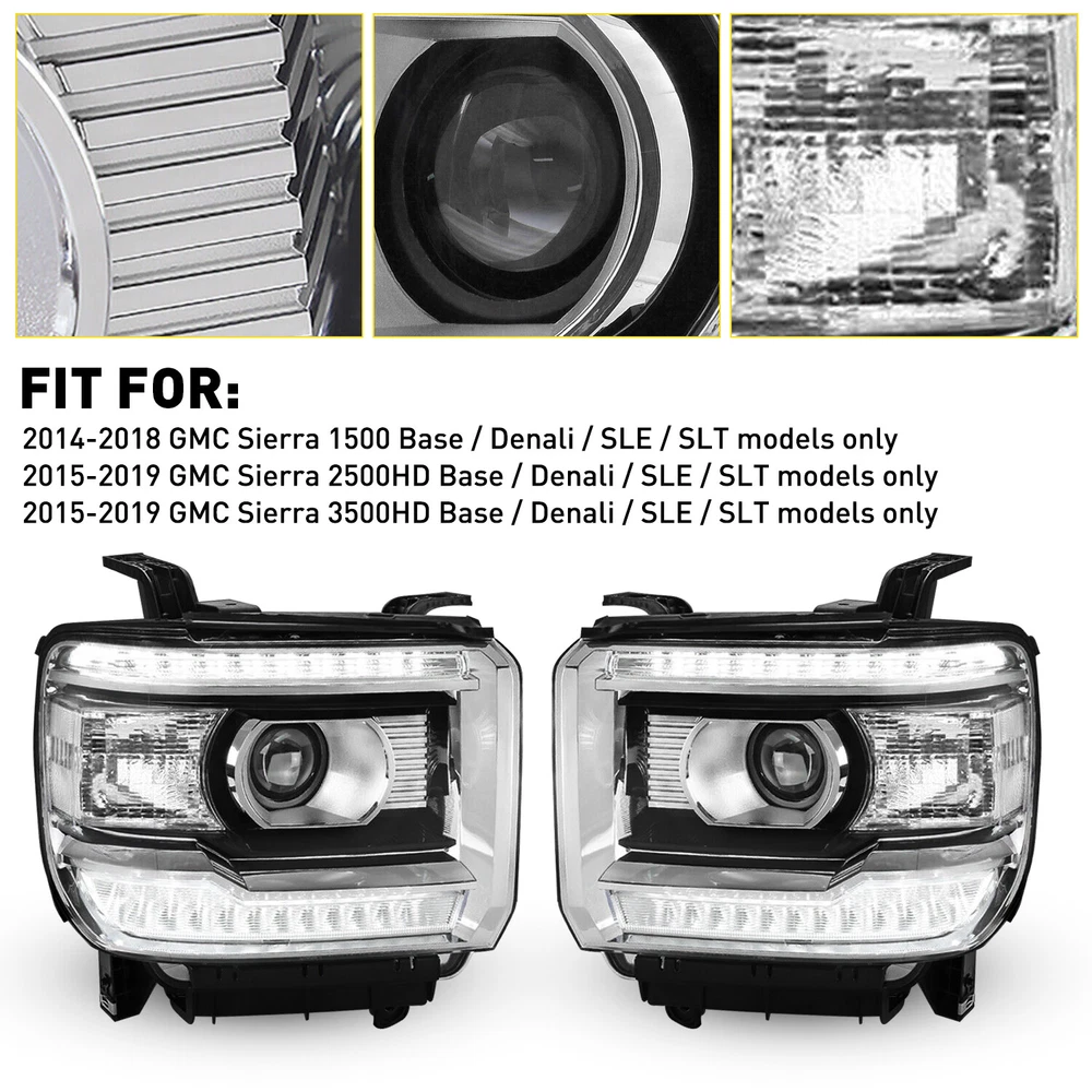 Projector Headlights Headlamps Fit For 2014-2019 GMC Sierra 1500 2500HD 3500HD Base Fit for: 2014-2018 GMC Sierra 1500 Base / Denali / SLE / SLT models only 2015-2019 GMC Sierra 2500HD Base / Denali / SLE / SLT models only 2015-2019 GMC Sierra 3500HD Base / Denali / SLE / SLT models only (compatible models with factory LED daytime running lights) (Does not compatible models with 2014 classic body style) (For models with factory non-LEDs lights headlights: This headlights will light up the bottom LEDs only by manually turn on the parking lights; the top LEDs will not turn on) Headlight Set FOR 2014-2018 Sierra GMC 1500 2015-2019 Sierra 2500 HD 3500 HD Projector Headlights Headlamps Fit For 2014-2019 GMC Sierra 1500 2500HD 3500HD Base Fit for: 2014-2018 GMC Sierra 1500 Base / Denali / SLE / SLT models only 2015-2019 GMC Sierra 2500HD Base / Denali / SLE / SLT models only 2015-2019 GMC Sierra 3500HD Base / Denali / SLE / SLT models only (compatible models with factory LED daytime running lights) (Does not compatible models with 2014 classic body style) (For models with factory non-LEDs lights headlights: This headlights will light up the bottom LEDs only by manually turn on the parking lights; the top LEDs will not turn on) (Fits models with factory halogen headlights only; Does Not fit models with factory Xenon HID headlights) Specifications: OE number: GM2502390, GM2503390, GM2502394, GM2503394 23130715, 23130716, 23130717, 23130718 Material: ABS+PC (ABS Plastic Housing/Polycarbonate lens) Appearance color: 1.Housing Color: Black 2.Lens Color:Clear 3.Reflector Color:White Note: Projector √(Include) DRL √ (Include) Bulbs × (Not include) Features: *Easy to install: Direct replacement, drilling and cutting are not required. *Superior quality: Made of ABS and PC materials with toughness and heat resistance functions to ensure its long service life and durability. *Angle adjustment: Equipped with a headlamp Angle adjustment knob, you can adjust the best Angle of view through the knob. *Suggestion: 1.Please confirm the OE number before purchasing!!! 2.Professional installation is required!!! Packaging include: Headlights*2(Left+Right) Item Specifics Brand AUXITO Manufacturer Warranty 5 Year Housing Color Chrome Placement on Vehicle Housing ColorLeft, Right, Front Lens Color Clear Bulb Shape Code Use Stock Bulbs Interchange Part Number GM2502390, GM2503390, GM2502394, GM2503394 Package Includes Driver & Passenger Side Headlights Bulbs Included No Material ABS Plastic, Polycarbonate Lens Certifications DOT, SAE Fitment1 2014-2018 GMC Sierra 1500 Base / Denali / SLE / SLT models only Fitment2 2015-2019 GMC Sierra 2500HD Base / Denali / SLE / SLT models only Fitment3 2015-2019 GMC Sierra 3500HD Base / Denali / SLE / SLT models only Number of Bulbs 0 Fitment Type Performance/Custom Type Headlight Assembly Features Reflector Housing, Projector Housing, Facelift Headlight OE/OEM Part Number GM2502390, GM2503390, GM2502394, GM2503394 OE/OEM Part Number GM2502390, GM2503390, GM2502394, GM2503394 Payment 1. We can only accept payment from PayPal. 2. Please keep the consistency of Paypal address and ebay address. Shipping 1. All items will be shipped in 12 hours after receiving your payment . 2. We ship this item to US only via USPS first class mail. It usually takes 3-5 working days to deliver. Returns 1. We offer 30 days return policy. 2. Please contact us within 30 days from the date you receive your package if you have any questions with the products . 3. Refund will be sent after we got your returned package. 4. All returned items should be in the original packaging with tracking number. Contact Us We work from Monday - Saturday 9:00AM - 6:00PM, but we will reply once we get your message. There will be delay on response if you send message or E-Mail on Sunday. DESCRIPTION PAYMENT SHIPPING RETURN POLICY CONTACT US Shop Category Store Home Other Hot Item Set of Delco 4 AC Oxygen O2 for Sensor 2003-2005 Cadillac Chevrolet GMC V8 5.3L USD 50.99 For 2002-2008 Dodge Chrysler Stereo Car Radio Wiring Harness Adapter USD 11.59 Door Latch Cables LH+RH Front For 2007-2013 Chevy Silverado 1500 2500 HD 3500 HD USD 17.99 Rear Left or Right Outside Door Handle for 2010-2016 Toyota 4Runner Lexus GX460 USD 14.99 Universal Car Windshield Wiper Squirter Washer Nozzle Spray Jet Kit Fluid Hose T USD 9.99 New List Item 12597567 EVAP Emisson Canister Vapor Purge Solenoid Valve fits Chevy Buick GMC USD 14.99 New Seat Recliner Adjustment Lever Handle Driver Side LH For 07-14 Chevy GMC USA USD 10.99 1 REPLACEMENT FOR FORD 2014-2019 FIESTA CAR FOG LAMP COVER BLACK LEFT WATERPROOF USD 14.99 AUXITO H4 9003 Super White 24000LM Kit LED Headlight Bulb High Low Beam Fog Lamp USD 52.99 8 Carbon Fiber Car Door Handle Door Bowl Cup Protector Film Anti-Scratch Sticker USD 11.99 Excellent Delivery Headlight Set FOR 2014-2018 Sierra GMC 1500 2015-2019 Sierra 2500 HD 3500 HD Projector Headlights Headlamps Fit For 2014-2019 GMC Sierra 1500 2500HD 3500HD Base Fit for: 2014-2018 GMC Sierra 1500 Base / Denali / SLE / SLT models only 2015-2019 GMC Sierra 2500HD Base / Denali / SLE / SLT models only 2015-2019 GMC Sierra 3500HD Base / Denali / SLE / SLT models only (compatible models with factory LED daytime running lights) (Does not compatible models with 2014 classic body style) (For models with factory non-LEDs lights headlights: This headlights will light up the bottom LEDs only by manually turn on the parking lights; the top LEDs will not turn on) (Fits models with factory halogen headlights only; Does Not fit models with factory Xenon HID headlights) Specifications: OE number: GM2502390, GM2503390, GM2502394, GM2503394 23130715, 23130716, 23130717, 23130718 Material: ABS+PC (ABS Plastic Housing/Polycarbonate lens) Appearance color: 1.Housing Color: Black 2.Lens Color:Clear 3.Reflector Color:White Note: Projector √(Include) DRL √ (Include) Bulbs × (Not include) Features: *Easy to install: Direct replacement, drilling and cutting ar