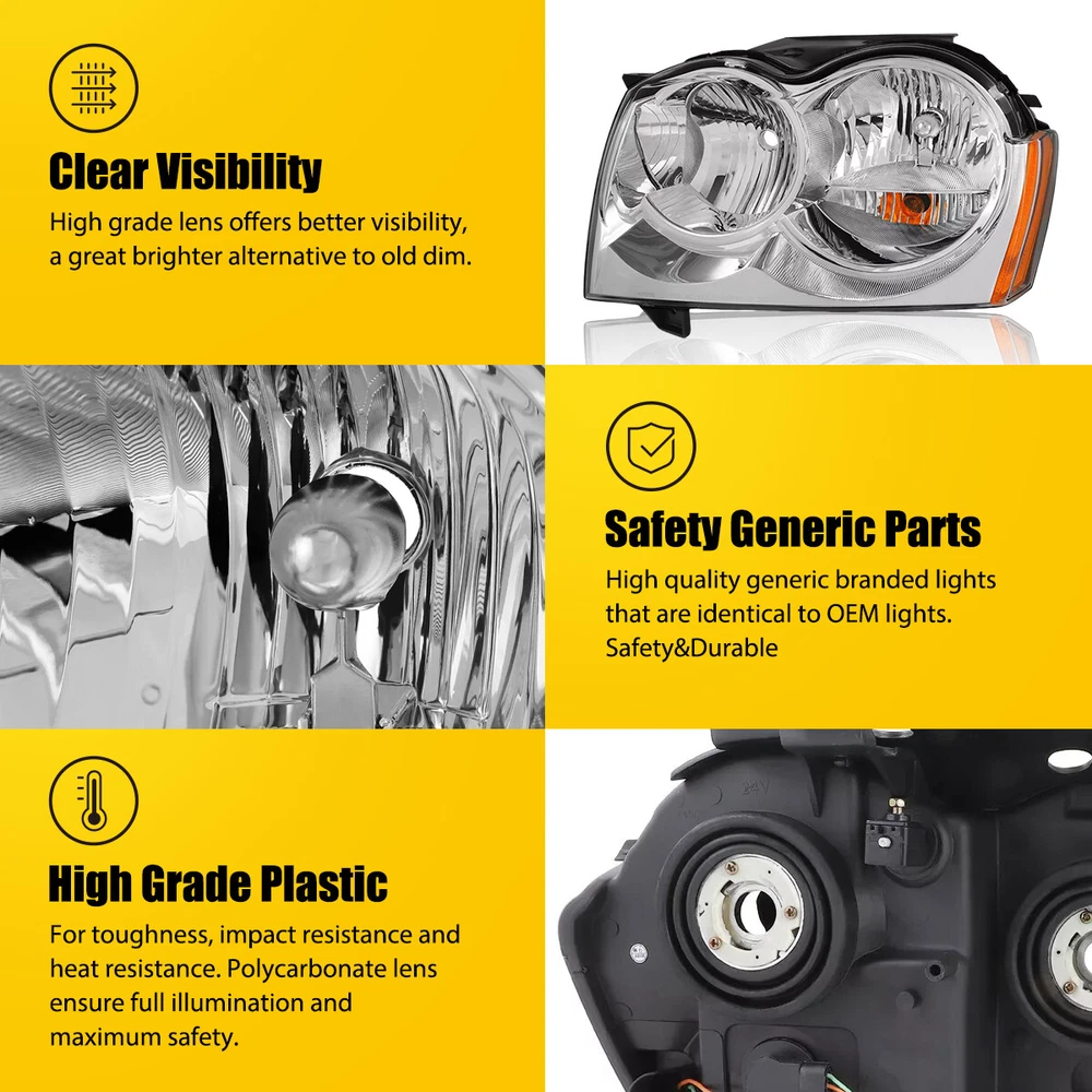Brand: AUXITO Placement on Vehicle: Left, Right Housing Color: Chrome Part Name: Headlight Quantity: Set of 2 Lighting Technology: Halogen Bundle Listing: Yes UPC: Does Not Apply OE Number: 55156351AK, 55156350AK Performance Part: No Interchange Part Number: 55156351AK, CH2502160, 55156350AK, CH2503160, 2007 2006 2005, Jeep, Grand Cherokee Driver Left and Passenger Right Side, Sport Utility, 6Cyl 8Cyl, 3.0L 5.7L 4.7L 6.1L 3.7L, Overland Limited Laredo SRT8 65th Anniversary Edition, Headlights Dri Certifications: DOT,SAE OE/OEM Part Number: 55156351AK, 55156350AK Fitment Type: Direct Replacement Universal Fitment: No Manufacturer Part Number: 55156350AK Type: Headlight Partslink Number: CH2502160, CH2503160 Superseded Part Number: 55156351AK, CH2502160, 55156350AK, CH2503160, 2007 2006 2005, Jeep, Grand Cherokee Driver Left and Passenger Right Side, Sport Utility, 6Cyl 8Cyl, 3.0L 5.7L 4.7L 6.1L 3.7L, Overland Limited Laredo SRT8 65th Anniversary Edition, Headlights Driving Head lights Headlamps Pair Set Manufacturer Warranty: 1-year unlimited-mileage warranty gtin13: Does Not Apply Part Link Number: CH2502160, CH2503160 Lens Color: OE comparable Number of Bulbs: 0 Other Part Number: 55156351AK, 55156350AK