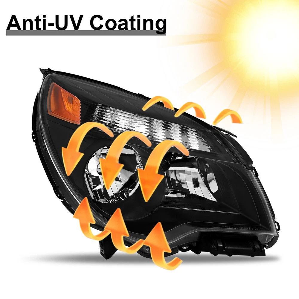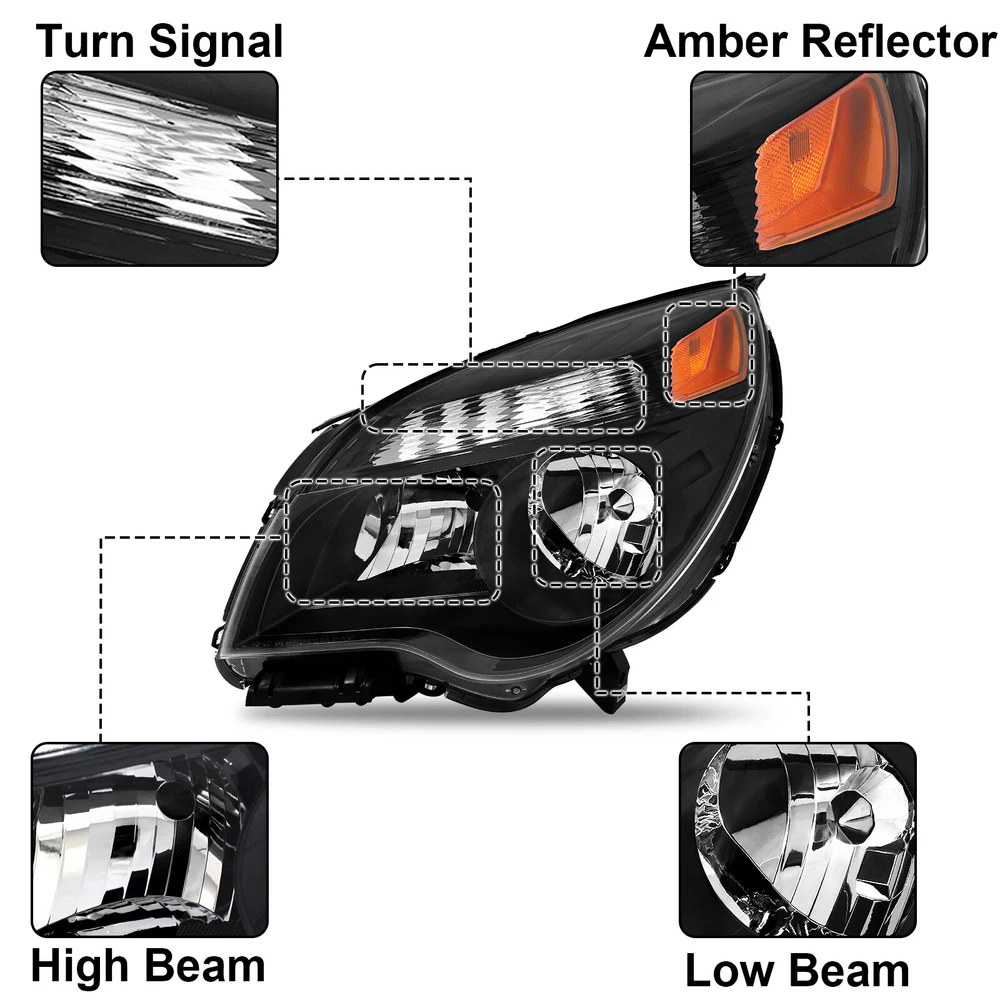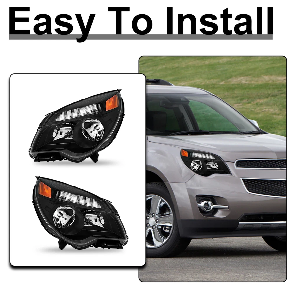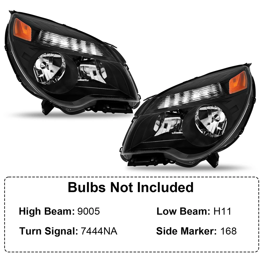 Headlights For 2010-2015 Chevy Equinox LT/LS Black Halogen Type Left+Right Pair Features: 1.Direct replacement for stock assemblies 2.Comes in pairs with driver & passenger sides (left and right) 3.DOT and SAE compliant with quality meeting or exceeding OEM units 4.All Headlight Lenses come with anti-yellowing/ageing coating 5.3-Months limited warranty 6.Increase your visibility during heavy rain, snow, dense fog and night time driving. Product Description: High Beam Bulb: 9005 Bulb (Bulbs are NOT included) Low Beam Bulb: H11 Bulb (Bulbs are NOT included) Turn Signal Light: 7444NA (Bulbs are NOT included) Housing Material: Plastic Lens Material: Plastic Black Housing Amber Reflector Compatible with: For 2010-2015 Chevy Equinox LT/LS Models Only ***Not Compatible with Factory HID Headlight Models*** Package includes: One Set Of headlights Driver and Passenger Side(Not include bulbs) Payment Shiping Policy Returns Policy Feedback Contact us Payment We accept PayPal, Google Pay, Credit Cards, and Debit Cards. Shiping Policy All Orders Will Ship Within Two Business Days.Except PR,HI,AK,GU and PO Box addresses. No local pick up All Packages Will Be Inspect Before Shipping, We Will Provide All Packing Material Needed For Your Package For Shipping Such As Boxes, Cushioning And Tape To Improve Shipping Quality. Very Important: Double check shipping address. We are not responsible for incorrect or undeliverable addresses. Returns Policy 60 Days returns satisfaction guarantee. All of Our Items Are 100% Brand New. If The Item Shows Up Defective or Broken, Please Contact Us Within 3 Business Days By Using "Ask A Question" Link Located At The Bottom of Our Listing. Your Questions/Concerns Will Be Responded Within 12 Hours Monday To Friday. Buyers May Contact us On The Weekends or Pubic Holidays And We Will Respond On The Next Working Day. We Will Offer Replacements, Exchange or Full Refund. 100% Satisfaction Guaranteed. We Will File Damage Or Lost Claim For Our Buyers Feedback We will leave a positive feeback immediately after payment is received. We appreciate a positive feedback as much as you do. If you have any issue with order,pls. contact us before leaving a feedback. We will glad to resolve your issue.Your satisfaction is our priority. Contact us If you have any concerns, Pls. feel free to contact us at any time.