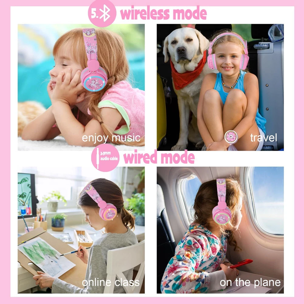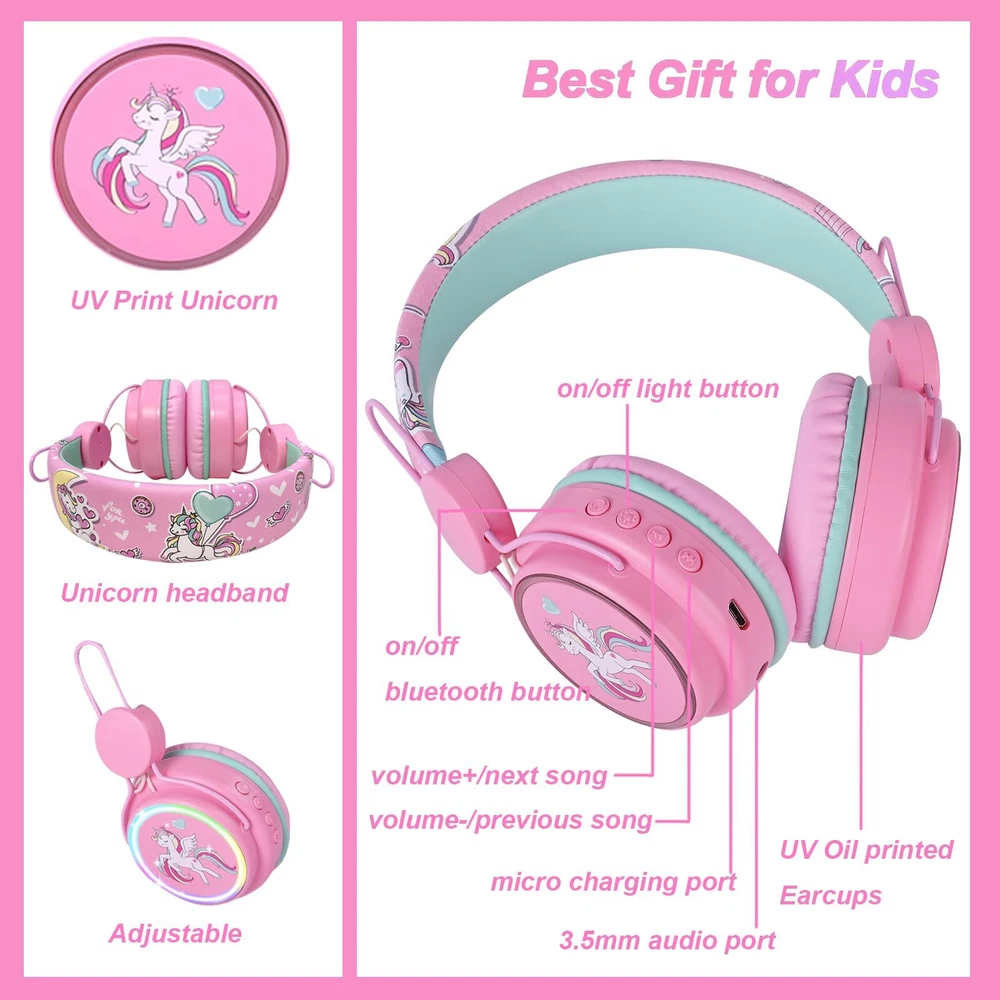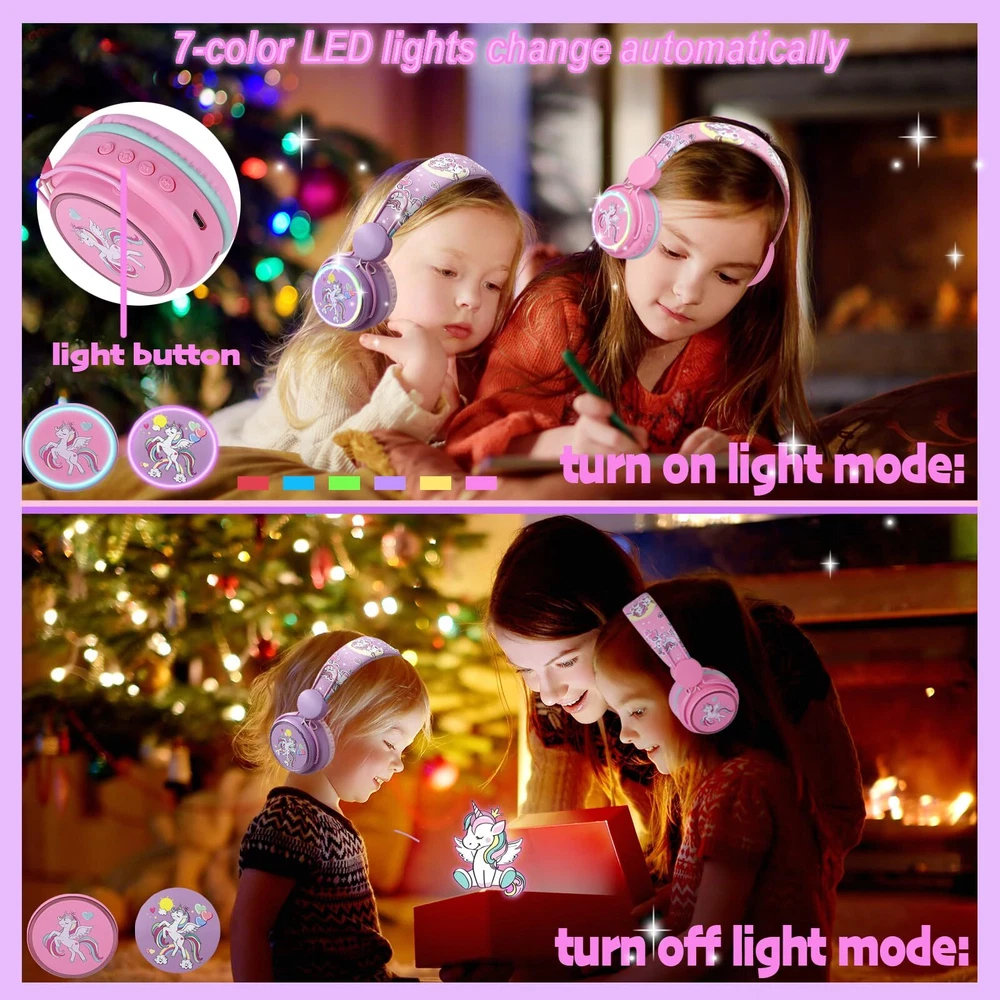 ♪Adjustable RGB LED Light: The light of bluetooth unicorn headphones work in variety modes to show different colors and lighting effect: color light or various colors light changes, keep glowing or flash with music rhythm, you can choose light color or lighting effect as you like. ♪Cute Unicorn Design: The bluetooth headphones designed with different unicorn and cartoon elements, cute cat ear/unicorn, printing clear, bright color. Fashion and super great gift for your on birthday/Christmas Day. ♪10 Hours Long Capacity Battery&Built-in Microphone: The wireless headphones has applied 400mAh battery, can last over 10 hour’s working time on a single charge. With built-in microphone, calling and communicate more convenient. It can meet your demands on study or relaxing, such as online classes, gaming, school use, travel and parties. ♪Wireless and Wired Work Modes: The bluetooth unicorn headphones has applied the latest and upgrade Bluetooth 5.0 technology provides fast and stable transmission without tangling wide range up to 10M, well with most smart phones, and other device in the market. And the wireless headphones has attached 3.5mm plug audio cable (1.2M length), you can use it as wired headphones, no worry about power shortage problem for the long travel. ♪Excellent Sound and Volume Control: The bluetooth headphones applied 40mm deep bass speakers, delivering clear sound and the volume can be adjusted to protect hearing when listening to music and calling, suitable for use on school, home, plane and car travel, parties etc. ♪Comfortable Fit and Adjustable: The cute unicorn headphones has soft earmuff and flexible headband ensure the headphones sit securely and remain comfortable even during prolong periods of use. The adjustable band allows you to get the perfect fit for your head shape. It is not only suitable for your children, but also for many adults. ♪Service: Any quality problems, please feel free to us, we will solve the issue and satisfy you.