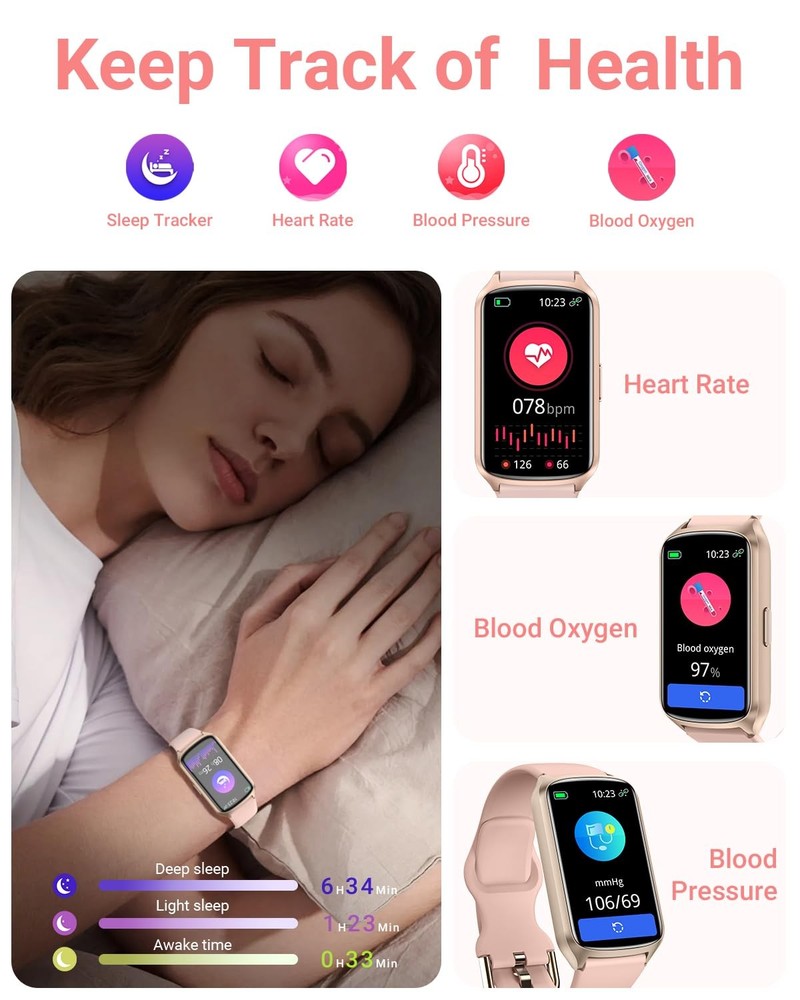Fitness Tracker with 24/7 Heart Rate, Blood Oxygen, Blood Pressure, Sleep Tracker, 5ATM Waterproof Activity Trackers with Step Tracker, Pedometer 【24H Accurate Health Monitoring】Measure your Heart Rate, Blood Oxygen, Blood Pressure and Stress with this Fitness Tracker. Understand your physical state, especially for high-intensity or outdoor work such as high temperature, brainstorming, stay-up and get professional analysis on how to relax in a healthier and better way. Fitness Tracker also analyzes sleep quality and score your sleep quality to help you adjust your sleep habits 【24 Sports Modes & Fitness Tracker】Fitness Tracker supports 14 sports such as walking, running, mountaineering, swimming, yoga, hiking, cycling, treadmill, etc . Accurately record all-day activities like steps, distance, calories burned, miles walked, active minutes and give professional analysis on improving your sports and daily habit 【Smart Life Partner with You】Check daily workout clearly on a 1.47'' HD bright color display. Create customized fitness schedules and goals, Get vibration alerts for all notifications, including phone calls, texts, and social media app alerts. Never miss a message with smart notifications delivered right to your wrist. You also can check real-time weather and change your music on the smartwatch 【15 Day Battery Life& 5ATM Waterproof】Fully charge for 2 hours, support 15 days standby time. Large capacity and low power consumption design offers longer endurance. fitness watch is designed with 5ATM waterproof, you can wear it when washing hands, in the rain and swimming 【1-Year Warranty Promised & Wide Compatibility】Compatible with iPhone, Samsung etc., built-in BLE5.0 and 300mAh lithium-ion battery. Our free APP "Gloryfit" supports iOS 9.0 / Android 6.0 or above smartphones. If you have any questions, please don’t hesitate to contact us with any problem