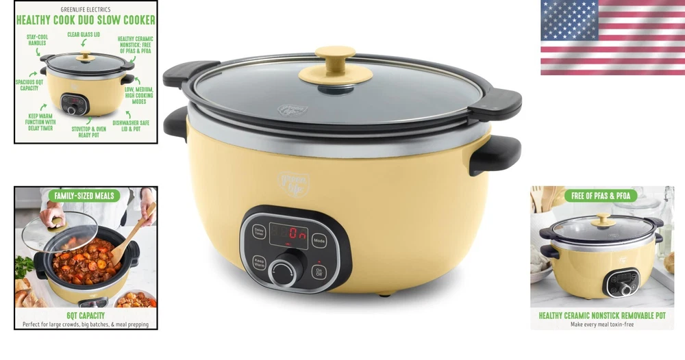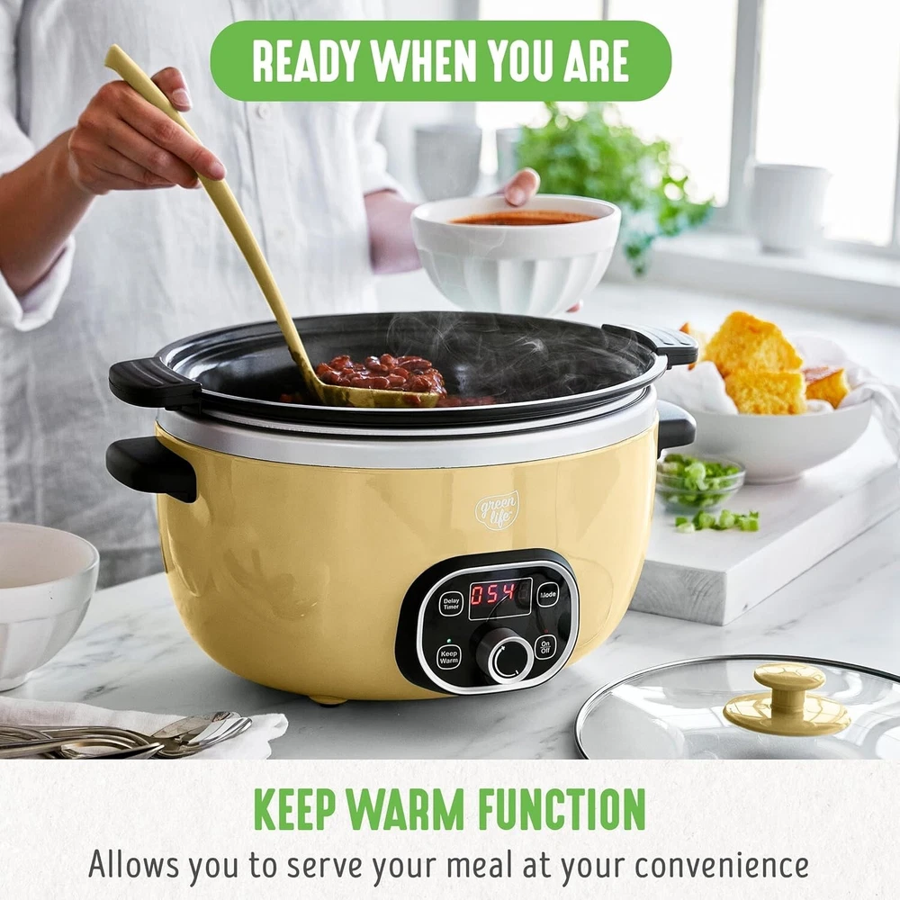 Voltage: 220 V Style: Slow Cooker Number Of Settings: 3 Power Source: Electric Material Type: Healthy Ceramic Nonstick Model: Slow Cooker Power: 240 W Capacity: 6 qt Is The Item Dishwasher Safe?: Yes Control Method: Touch Size: 6 Quarts gtin13: Does Not Apply Features: Dishwasher Safe, Non-Toxic, Ceramic Nonstick, Removable Interior Bowl, Programmable, Family Friendly, Keep Warm, Stovetop Safe, Oven Safe, Easy to Clean, Delay Timer, Timer, Clear Glass Lid Color: Butter Yellow UPC: Does Not Apply Wattage: 240 Watts Item Depth: 11 in Maximum Timer Setting: 10 hrs Control Type: Digital Finish: Glossy Brand: Unbranded Pattern: Solid Number of Settings/Programs: 3 Item Dimensions D X W X H: 14.29"d X 14.29"w X 10.91"h Global Trade Identification Number: 00885837043310 Material: Ceramic Type: Slow Cooker Item Weight: Not specified Components Included: Lid, Pot Is Dishwasher Safe: Yes Product Dimensions: 14.29"d X 14.29"w X 10.91"h