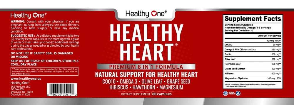 Each container offers 30 servings of 2 capsules daily, providing a potent blend of all-natural ingredients: COQ10, Omega 3 Fish Oil, Olive Leaf, Grapeseed, Hibiscus, Hawthorn Berry, Garlic, and Magnesium Glycinate. Support optimal heart health with a meticulously crafted supplement, free from artificial additives and designed to promote cardiovascular wellness. Formulated as essential heart vitamins that cater individuals of all ages and lifestyles, providing all-encompassing assistance for blood flow and heart health. Enjoy peace of mind with each 60-piece capsule heart health supplement, crafted without GMOs, dairy, or soy and free from preservatives, binders, sugar, and starch. Try Healthy Heart Supplement risk-free with our money-back guarantee. Contact us via email or phone if you are dissatisfied.