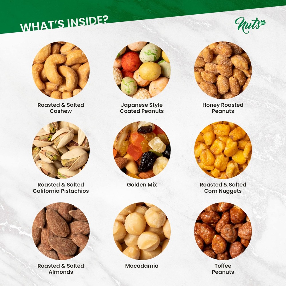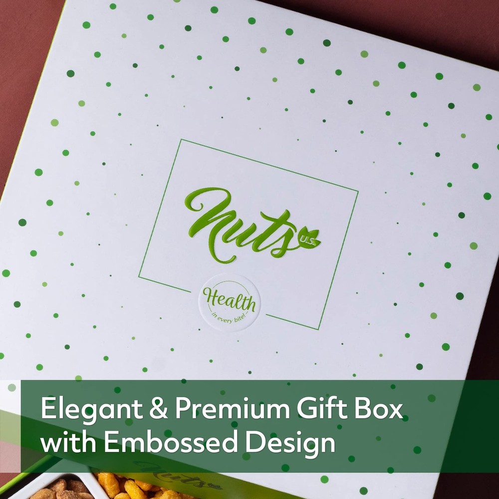 9 variety of nuts and dried fruit blend in outstanding gift box. Gourmet Assorted 9-Variety Gift Basket: Experience the gourmet blend of sweet and savory with 9 premium varieties, including California Pistachios, Cashews, Macadamia, Almonds, Honey Peanuts, Toffee Peanuts, Corn Nuggets, Japanese Mixed Nuts, and Assorted Nuts. Perfect for gifting or indulging at home. Freshly Roasted for Satisfying Crunch: Our nuts are roasted at optimal temperatures to lock in their natural flavors and crunchiness. A Thoughtful Gift for All Occasions: This gift box is ready for Christmas, New Year, Valentine’s Day, Birthdays, Anniversaries, and Corporate Events. Whether you’re celebrating a milestone or showing appreciation, this gourmet snack box makes every moment special. Wholesome and Healthy Snacks: Made with all-natural, vegan-friendly ingredients, this assortment is a healthier choice for snacking. Rich in protein and free from trans fats, it’s a heart-smart option for anyone on your gift list. Proudly Packed and Shipped in the USA: Each gift box is prepared in the USA to ensure top-quality freshness and safety. Perfect for sharing with family, coworkers, clients, or as a hostess gift, this beautifully packed set is ready to impress.