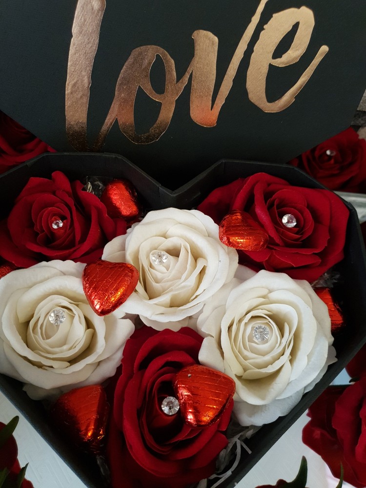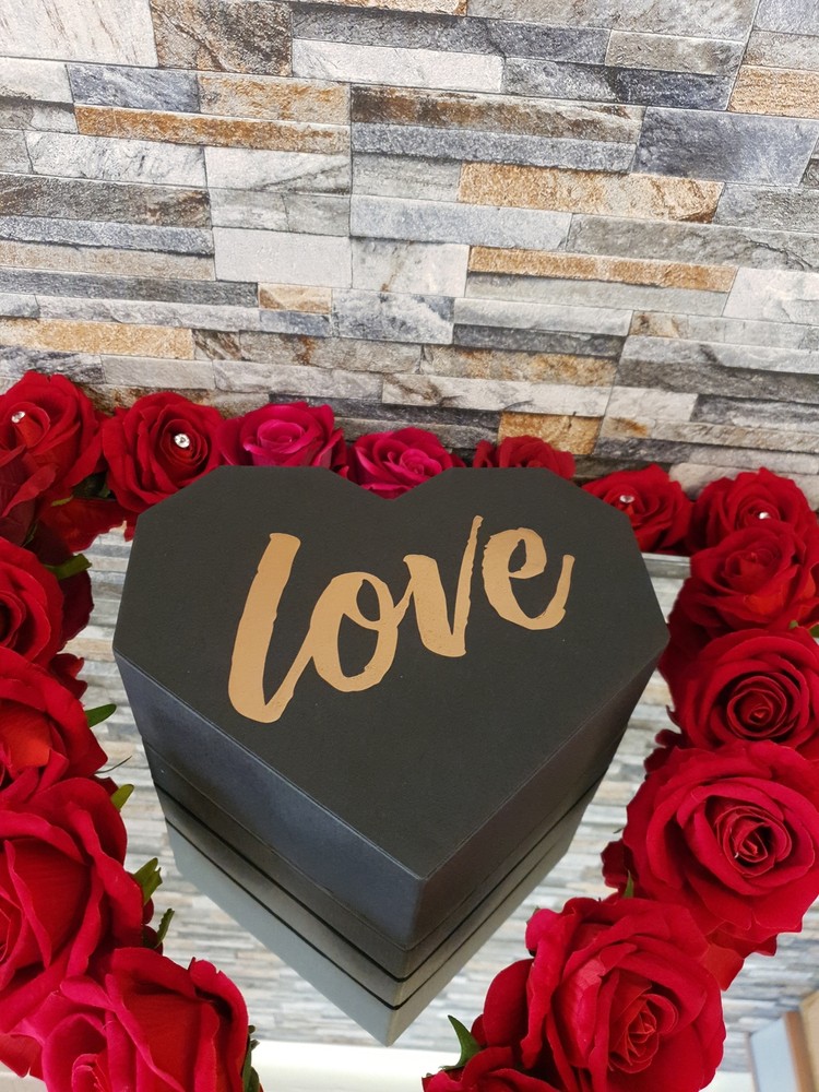 This Gift Box is a Luxury gift to your loved ones elegant and glamorous box with artificial roses. You can customise your box and make it extra special. Free customisation. You can request different flowers colour , different types of chocolates or add more items we will do our best to make it possible You can add messages and note to your basket. No Need for wrapping You can add a message to your gift at the checkout No Substitution what you see is what you will receive This Gift Box Includes: 1 Gift Box Heart shape Milk Chocolate Lindor Chocolate You can add extra items to your box from our collections e.g. Jewellery or keyrings and more. Extra Large Velvet Rose with Crystal