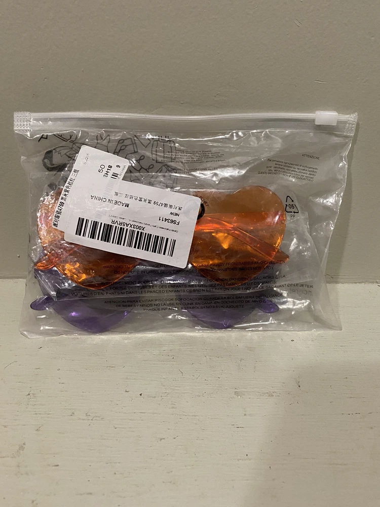 These are a set of three heart-shaped party sunglasses in purple, orange, and gray colors. The frame is transparent with a multicolor heart design, perfect for women's accessories. The lenses are made of plastic, making them suitable for a fun and stylish look. Perfect for adding a playful touch to your outfit.