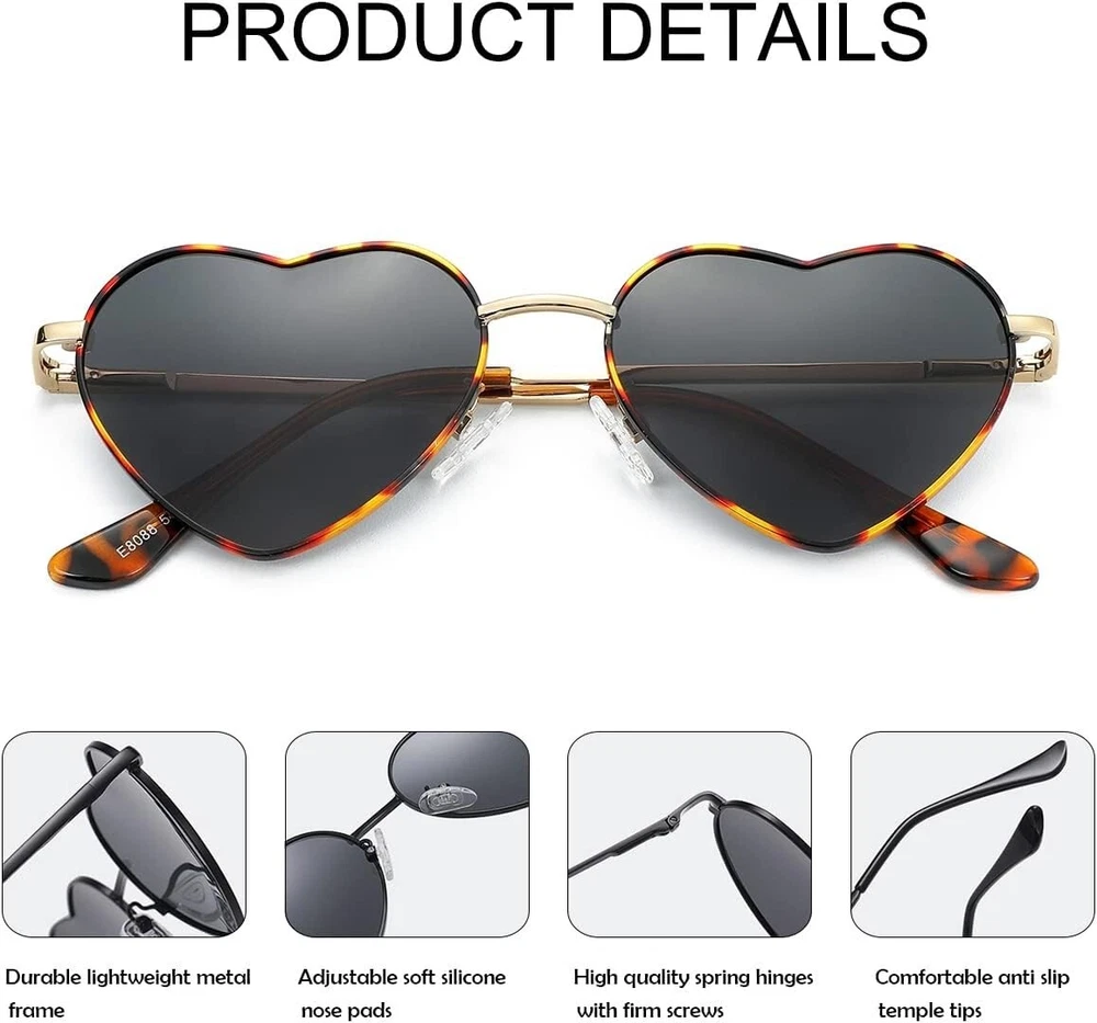 Heart-Shaped Polarized Sunglasses for Women - UV400 Protection and Fashion Charm ‹ › ‹ › ‹ › ‹ › ‹ › ‹ › ‹ › ‹ › Heart-Shaped Polarized Sunglasses for Women -UV400 Protection and Fashion Charm Features: Lens Width: 54mm, Frame Height: 45mm, Nose Bridge: 18mm, Frame Width: 139mm, Temple Length: 140mm, Net Weight: 17.7g. Scratch-resistant polarized lens with anti-glare coating Thin sturdy metal frame Soft anti-skid nose pads Solid stainless steel metal hinges Exquisite temples for long lasting wear and comfort Polarized UV400 lens for superior visual experience and glare protection Fashionable heart-shaped silhouette and vintage style Lifetime Breakage Warranty on frame & lens 100% Satisfy and 30 Day Money Back Guarantee Benefits: Provides 99% polarization efficiency while blocking UV and HEV light Perfect for driving, running, fishing, beach, climbing, sports, and outdoor activities Makes you more attractive and eye-catching in outdoor activities or parties Comfortable to wear for long periods Quality assurance and satisfaction guarantee Why choose our Heart-Shaped Polarized Sunglasses? Stand out from the crowd with our stylish and functional Heart-Shaped Polarized Sunglasses for Women. With scratch-resistant polarized lenses, a sturdy metal frame, and a fashionable design, these sunglasses are perfect for all your outdoor activities. The UV400 protection and glare reduction make them ideal for driving, sports, and beach days. Plus, with our lifetime warranty and money-back guarantee, you can shop with confidence. Elevate your style and protect your eyes - order your Heart-Shaped Polarized Sunglasses today! Shipping Free & Fast Shipping - We offer free shipping to most of the USA with a normal delivery time of 3-7 days. However, due to the current situation, additional delivery time (up to 3 weeks) may be required for some items. Alternative Carriers - We may use alternative carriers (e.g. USPS, FedEx, UPS, etc.) to ensure your package arrives safely and on time. Due to the use of multiple carriers, we are unable to provide a tracking number automatically. Handling Time - Orders are processed and shipped within 1-2 business days of receiving cleared payment. Shipping Restrictions - Shipping to Alaska, Hawaii, Puerto Rico, Guam, and other US territories may incur shipping charges or delivery restrictions. Please contact us before ordering, or your order can be refunded/cancelled. State Restrictions - There may be restrictions based on your state of purchase. For example, certain items may not be shipped to California due to state regulations. Contact for Tracking Updates - If you require tracking updates or have any concerns about the delivery of your order, please feel free to contact us, and we will be happy to assist you. Return 30-Day Hassle-Free Returns - We want you to be completely satisfied with your purchase. If you are not, you can return the item within 30 days of receiving it for a full refund or exchange. Easy Return Process - To start a return, simply contact us and we will provide you with a prepaid return shipping label and detailed instructions. Restocking Fee - There are no restocking fees for returns. However, the buyer is responsible for return shipping costs if the return is not due to a seller's error. Refund Processing Time - Refunds will be processed within 5 business days of receiving the returned item in its original condition. Payment We accept all major credit cards, PayPal, and Apple Pay for your convenience. Your payment information is secure and encrypted to ensure a safe and seamless transaction. Please complete your payment within 3 days of purchase to avoid any delays in shipping. Feedback Your feedback is extremely important to us. We strive to provide the best products and customer service possible. If you are satisfied with your purchase, please take a moment to leave us a positive review. If you have any concerns or issues with your order, please contact us before leaving negative feedback. We are committed to resolving any problems and ensuring your satisfaction. Contact Us If you have any questions or concerns, please feel free to reach out to our customer support team. You can contact us through the eBay messaging system. We are available Monday to Friday, 9:00 am to 5:00 pm EST, and we will do our best to respond to your inquiry within 24 hours. Thank you for supporting our small family business!