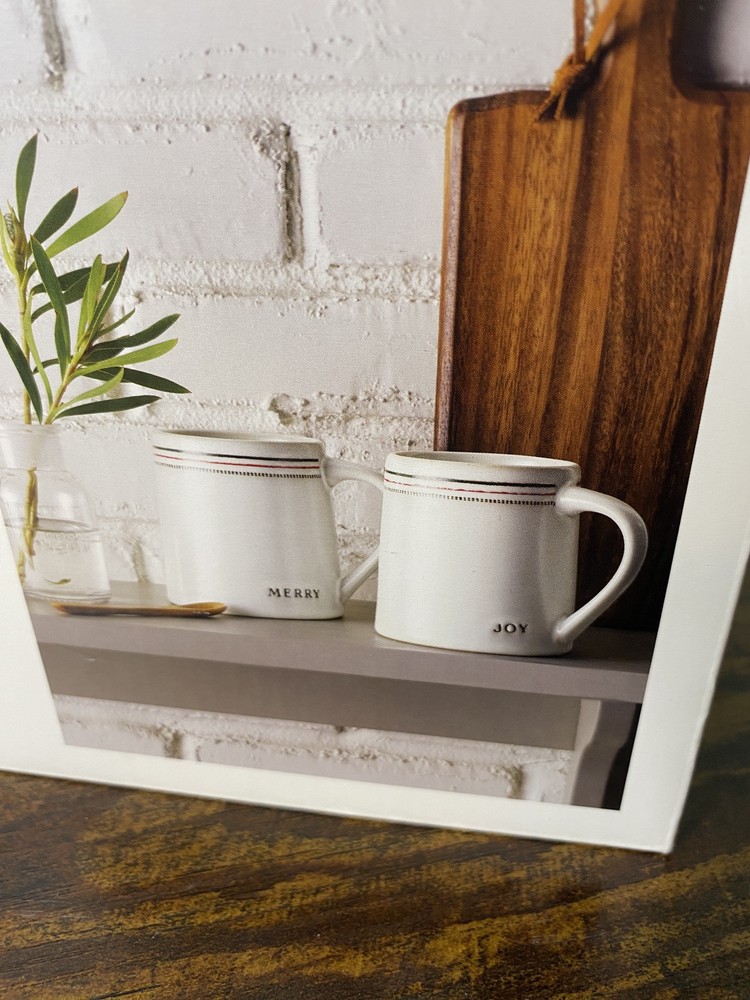Hearth & Hand by Magnolia Stoneware 2 Mugs Joy Merry Set is a charming addition to your kitchenware collection, perfect for the Christmas season. The set includes two cream-colored mugs with the words "Joy" and "Merry" printed on them in a farmhouse style. Made of durable stoneware, these coffee mugs are microwave and dishwasher safe for convenience. Ideal for enjoying your favorite hot beverages during the holidays or as a thoughtful gift for a loved one.