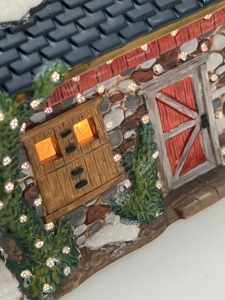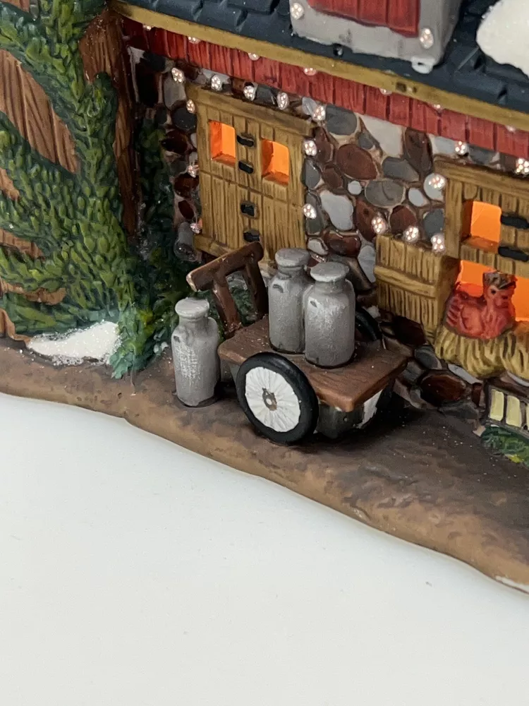 The Heartland Valley Fibre Optic Barn O'Well 2005 is a medium-sized, hand-painted porcelain Christmas village Barn featuring a whimsical red barn design. It is illuminated with color-changing lights, creating a 3D effect. Suitable for seasonal display in any room, this American-style piece from the Heartland Valley Christmas Village collection is a retired item. It includes a charger cord and is ideal for adults who enjoy collecting lighted houses and Barns . Excellent condition! No original box , comes with cord & light .
