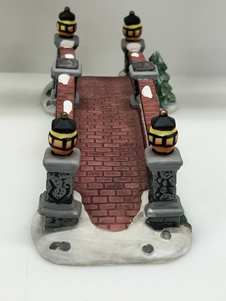 The product is a Heartland Valley Village Deluxe Porcelain Bridge that comes in its original box with Styrofoam. It is a Christmas Village item that is 3 inches in height, 9-1/2 inches in length, and 3 inches in width. The bridge is made of porcelain and is shaped like a bridge. It is an original piece in excellent condition!