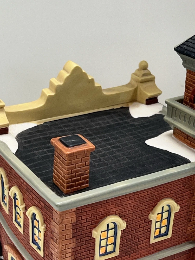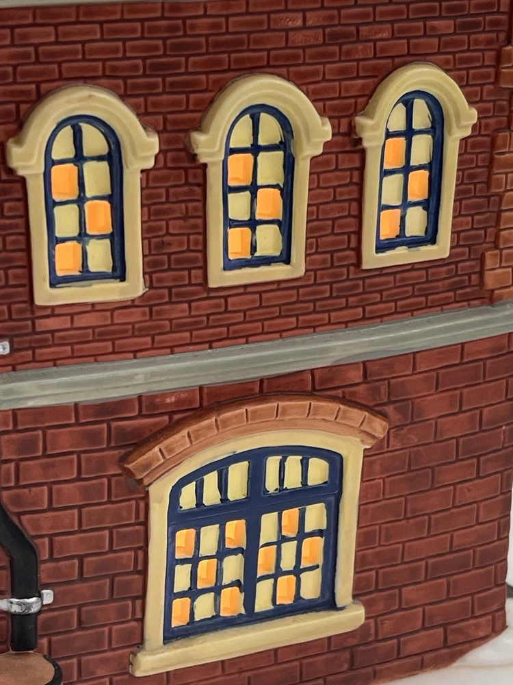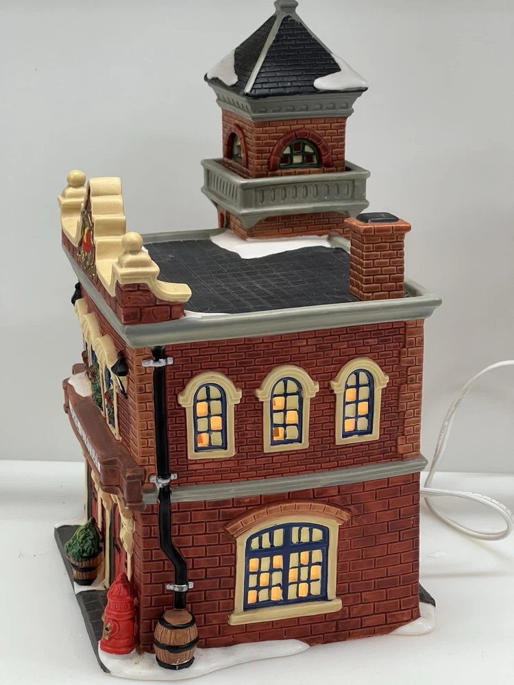 The Heartland Valley Village Fire Station 1999 O'Well Deluxe Lighted is a medium-sized porcelain Christmas village house from the late 20th century. It features a traditional style with a whimsical pattern, depicting a fire station with multicolor illumination. This collectible item, part of the Heartland Valley Village collection, is suitable for decoration in any room during the festive season. The hand-painted and boxed piece adds a charming touch to holiday decor with its asymmetrical shape and fire-themed design. Excellent condition! Comes with all original packaging including cord & light . Outer packaging sleeve has been taped
