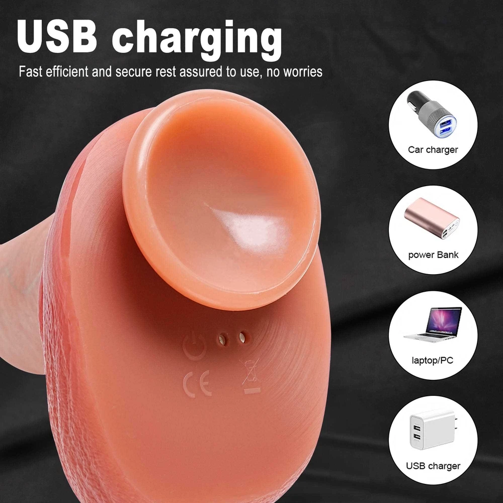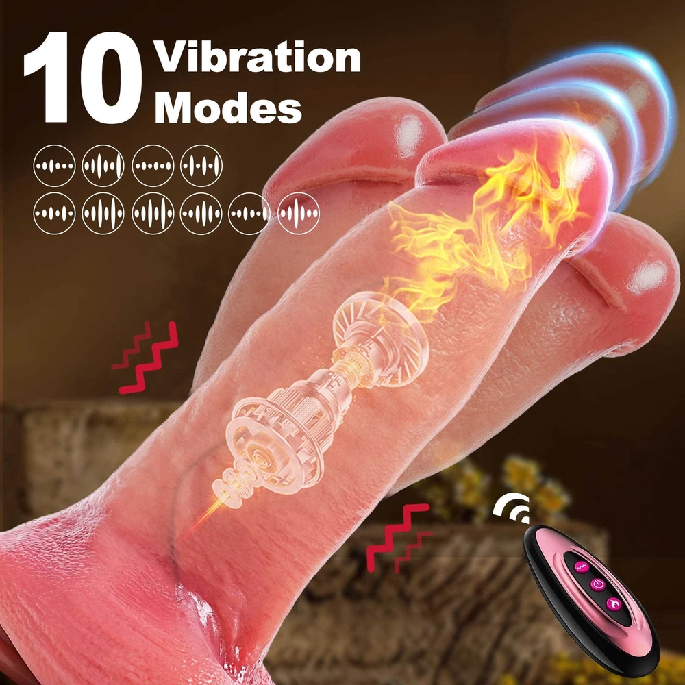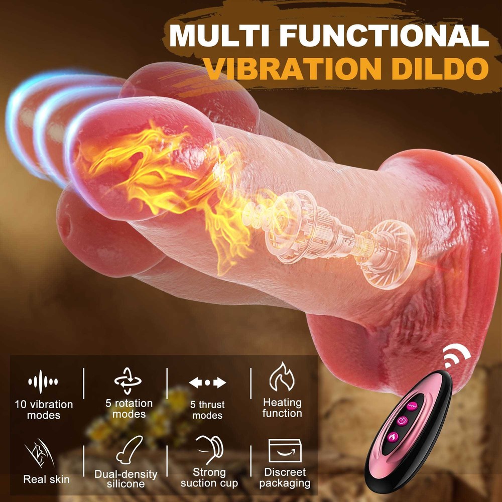 Discreet Package Vibrating&Thrusting&Rotation&Heating&Dildo with Remote Control Features: 【10 Vibration Modes 】 Dildo built-in powerful motor in the glans part, featuring 10 vibration modes , providing intervals, continuous patterns, and high frequency but minimal noise .Ensuring intense and screet stimulation. 【5 Thrusting & 5 R otation】 Short press thrusting /Rotation button to cycle through the thrusting and Rotation vibration mode .5 thrusting and rotation modes can be selected. 【 Heating Function】 Short press the heating button to start the heating function . 【Gentle & Liquid Silicone】 Vibrator dildo crafted from body-safe liquid silicone, ensuring a soft and gentle touch that won't harm sensitive body parts, providing peace of mind during your intimate moments. 【Realistic 】 I ntense lifelike texture, including skin-like veins, juicy balls and a pronounced head, ensures a highly stimulating and authentic experience with every use. 【Easy to Charge】 This multifunctional vibrating dildo is charged using a USB charger. It takes about 2 hours to fully charge and can be used continuously for about 1 hour. Specifications : 1. Rated voltage 3.7V, rated current 8A 2. Material: Liquid silicone 3. Waterproof: life waterproof 4. Charging time: about 2 hours to full , can be used continuously for about 45-60 minutes 5. Remote control battery: 12V 27A 6.Size: Total length: 24cm/9.44in Insertable length: 19.5cm/7.67in Penis Diameter: 5.7cm/2.24in Weight: 768g/1.69lb Package Content : Vibrator *1 Charging cable *1 Remote control *1 Manual *1 Discreet Packaging & Customer Service: Your privacy is extremely important to us. Package is packed in totally discreet so you could order in complete confidence. If you need any help, be sure to tell us promptly, we are always online to give you the most satisfactory customer service.