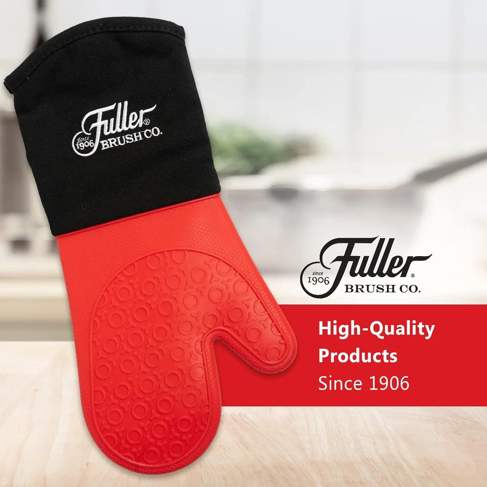 Silicone Oven Glove PROTECTION WHEN YOU NEED IT: Fuller Brush Silicone Oven Glove protects your hands and forearm from the hottest plates, pans, dishes, oven grates and more. The non-slip textured red silicone exterior provides a sturdy grip and heat resistance to 500 degrees. BEST DESIGN EXTRA LONG SLEEVE: The extra-long black sleeve extends additional distance up your arm for better protection on your wrist and forearm area. Glove measures over 14 inches in total length. EXTRA COMFORT: Fuller Brush Silicone Oven Glove is designed with an insulated quilted soft interior for added comfort and lined with polyester for extra durability. Glove can be used with right or left hand for convenience. MULTIPLE USES: In addition to protecting your hands and forearm around the oven, toaster and stovetop, this Silicone Oven Glove provides stylish protection while grilling with a barbecue or cooking with an outdoor smoker or pizza oven. TRUSTED BRAND: Since 1906, Fuller Brush has provided high quality, American-made products and unique imported products following Fuller’s strict quality specifications, which are designed to work and built to last. Whether you’re looking for cleaning tips or the specific cleaning products to do the job, Fuller Brush has you covered! Product Description Your Cleaning Supply Experts. Fuller Brush is focused on providing modern remedies for today's cleaning needs. With more than 115 years of cleaning experience, we have the know-how and expertise to provide you with cleaning supplies to make home cleaning much faster, better and easier. Using high-quality materials and expert construction, Fuller Brush offers a complete line of distinct, top-quality cleaning products. No matter what your cleaning needs are – whether you're looking for cleaning tips or the specific cleaning products to do the job – Fuller Brush has you covered! Protection From Heat Tired of wondering if a hot pad or short silicone glove will protect your hand and forearm? Many silicone mitts or gloves barely cover your hand to the wrist, which make it difficult to carry large plates or dishes with confidence. Fuller’s Silicone Oven Glove makes it easy to protect your hand and forearm from the hottest plates, pans, dishes, oven grates and more. The one-piece red silicone area protects your hand on both sides with heat resistance to 500 degrees. And, the extra-long Glove at 14.5 inches in total length helps protect your forearm when reaching into the oven or carrying large hot items. Quality Construction With Comfort Tired of losing your grip on a very hot pan or heavy casserole dish? The non-slip textured silicone exterior provides a secure and sturdy grip. The insulated quilted soft interior provides comfort and extra protection from the fingertips all the way up the forearm black cuff area, while the polyester lining provides extra durability. The Glove can be used with right or left hand for convenience. Fuller Brush Silicone Oven Glove Better Protection Every cook needs the protection offered by the Fuller Brush Silicone Oven Glove. Removing hot dishes and pans from the oven can be risky when using square potholders. Your hand can slip and contact the hot pan and your forearm is exposed to hot oven racks. Hot liquids and steam can cause burns when passing through or around fabric hot pads. The Glove’s one piece red silicone area covers your entire hand and will not allow hot liquids or steam to reach your hand, and the black cuff area covers your forearm to provide protection from steam while draining boiled pasta, potatoes or vegetables. Barbecue With Style Looking for heat protection while grilling with the barbecue, smoking meats or cooking with the pizza oven? This stylish Fuller Brush Silicone Oven Glove will protect your hand and forearm from the heat and flare-ups while flipping your favorite barbecue food on the grill or removing pizza from your outdoor oven. Conveniently hang this Oven Glove with the built-in hang-up loop. Over 115 Years Of Excellence Since 1906, Fuller Brush has provided high-quality products that are designed to work. Each product is made with the highest quality workmanship under strict quality standards. Whether you're looking for household or cleaning products, hairbrushes or personal care lotions, Fuller Brush has you covered. Item model number 55053-FB Item Package Quantity 1 Color Red Shape Hand Item Weight 5.9 ounces Outer Material Polyester, Silicone Fill Material Polyester Number of Pieces 1 Product Dimensions 14.5"L x 14.5"W Product Care Instructions Machine Washable. Avoid high heat settings. Air dry. 14.5 "w x 14.5 "w. Weight: 5.9 oz Shipping from the USA All of our products are shipped from the USA, ensuring quick delivery to your destination. Payment We offer the following payment methods: PayPal, credit card, bank transfer, and eBay's secure payment system. Free Shipping & Free Returns Shipping within the USA is FREE. Additionally, any return is absolutely free for you. Risk-Free Purchase You have the option to return an item within 30 days without any justification. We cover the return shipping costs! Fast Shipping We ship immediately upon receipt of payment. Generally, the package is delivered within 2-3 days in the USA. If it takes longer, we will contact you. Quality and Costs Made in Europe, USA, China No customs fees or additional charges Total satisfaction guarantee Invoice with declared VAT available upon request in .pdf format Feedback Your feedback is very important to us. After you pay for your purchase, you will automatically receive positive feedback from us.