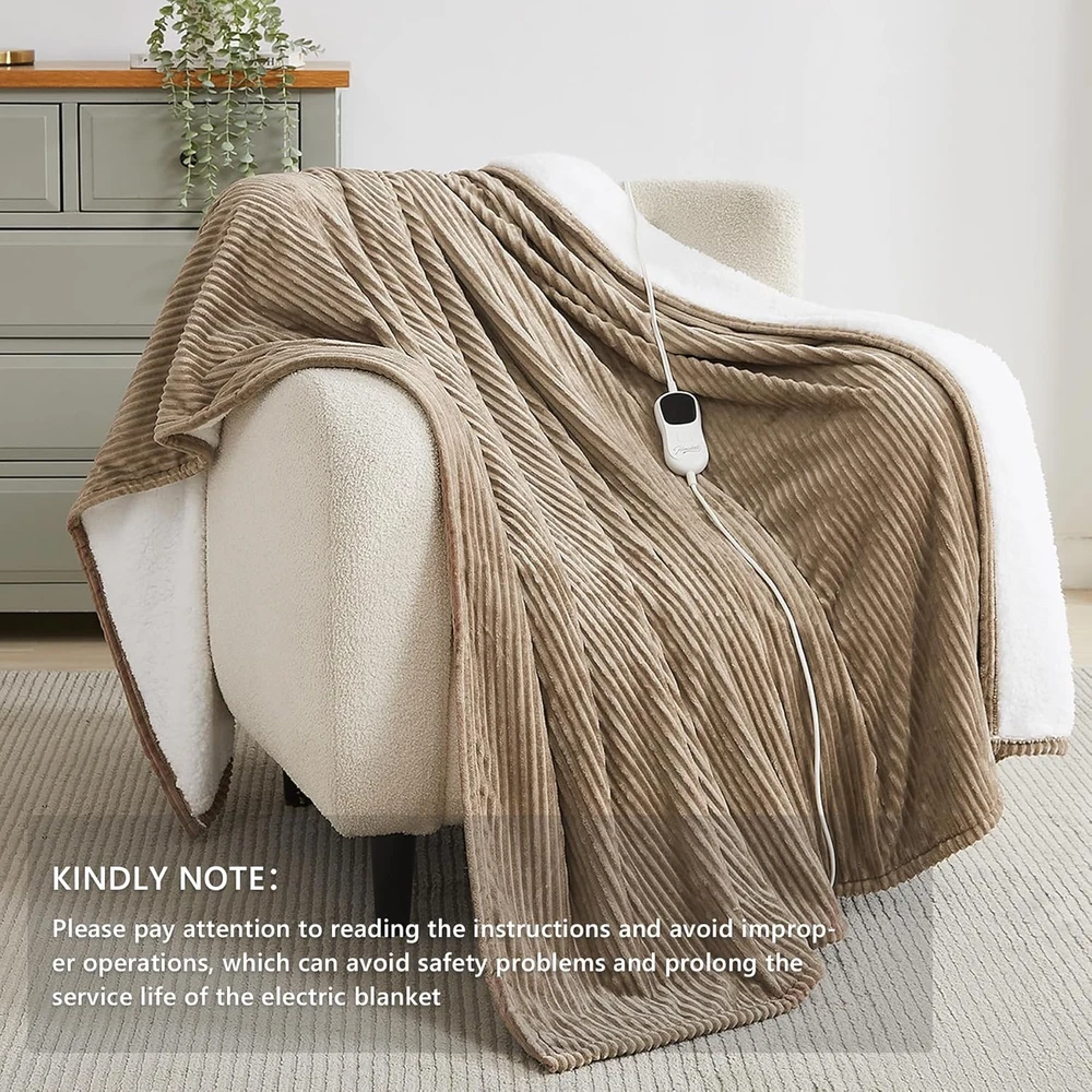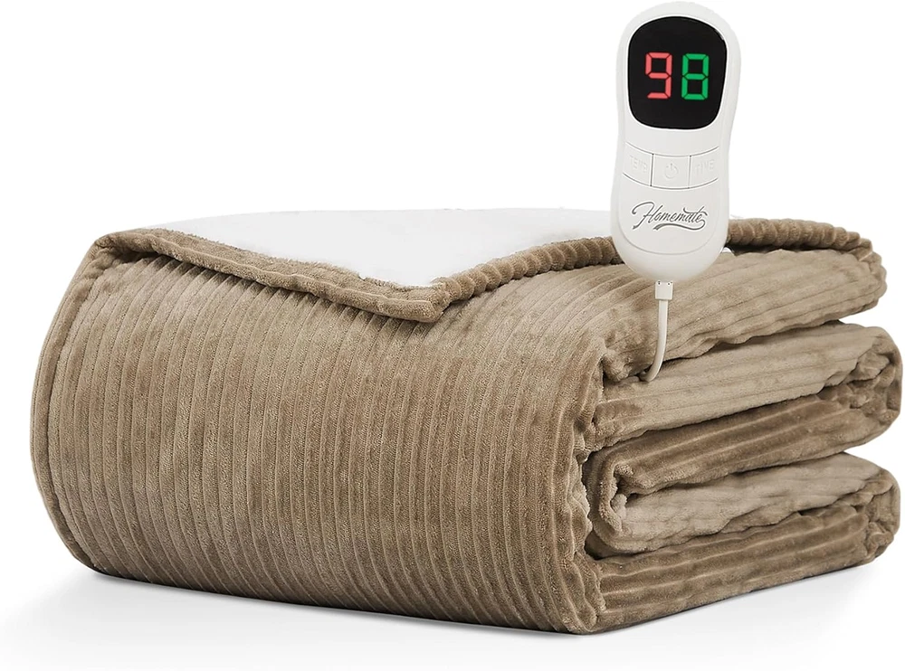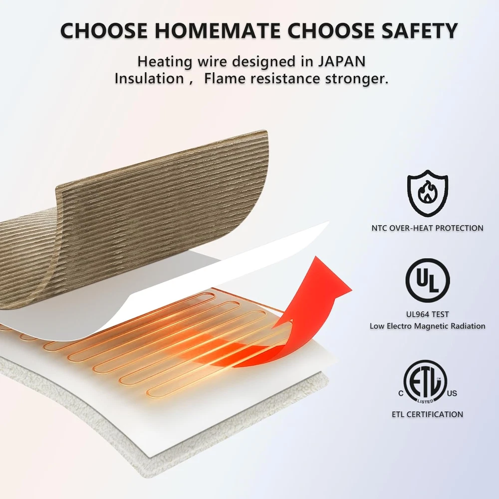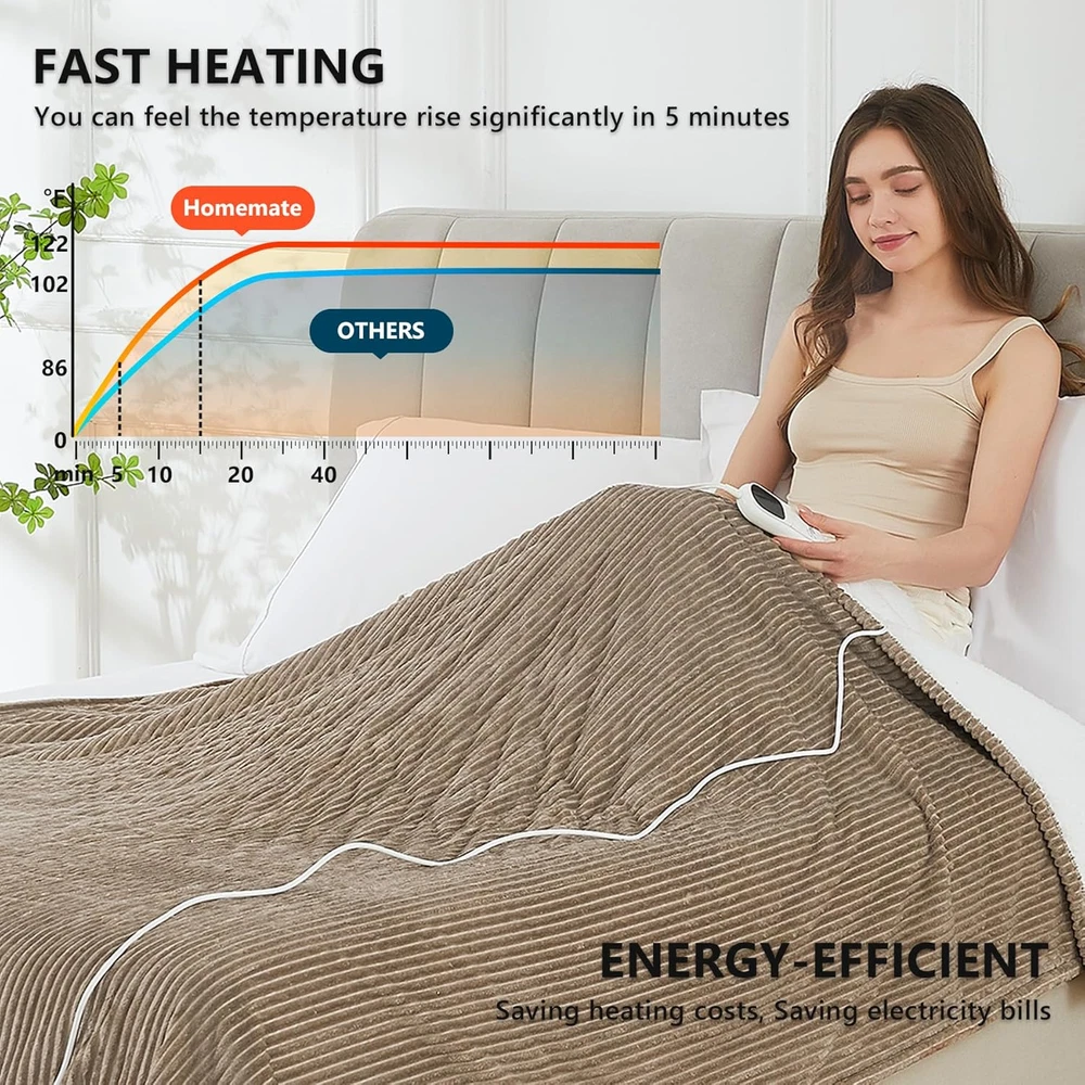 Flannel + Sherpa 【PREMIUM MATERIAL】: 220gsm flannel + 200gsm sherpa.The fabric is very soft,thicker than normal blankets,and warmer than normal blankets even without electricity.The fabric is durable and does not shed.The diameter of the heating wire is 2.2 mm,and the existence of the heating wire is hardly felt during use,which is more comfortable. 【SAFETY】: Homemate Heated blankets have passed the American safety UL964 Test.Have ETL Certification.Lower Electro Magnetic Radiation.The heating wire is designed and produced by Japanese company,more advanced technology,stronger insulation and flame resistance.Moreover,the heated blanket use NTC overheating protection technology to ensure that it will not overheat and cause burning. 【ENERGY SAVING】: Homemate heated blanket use the intelligent temperature adjustment technology.When the temperature rises,the heated blanket will automatically adjust the temperature according to the surrounding environment,which can always provide users with a comfortable feeling and is conducive to energy saving.Compared with air conditioner,using Homemate heated blanket is more energy efficient,and you can save more heating costs in winter. 【EASY TO USE】: Homemate heated blanket have 10 heat levels,1/2/4/6/8 hours auto shut off.Temperature range is 86-122°F.Very convenient to use,even the elderly,the sick,and the disabled can use it easily.Power Cord is 12.5 feet,this long cord makes the use of the blanket more flexible,can be used on the bed,on the sofa,can be used in the study and office,very convenient. 【LARGER HEATING AREA】: The heating wire used in the Homemate electric blanket is longer, so the heating area is larger and the heat distribution is more uniform. 【BEST GIFT】: Homemate heated Blanket is the best gift for birthday or other holiday like Christmas,New Year's Day. And the use of electric blankets is good for relieving muscle soreness and joint pain, it is a great gift for the elderly, patients, and people recovering from surgery. Product Description